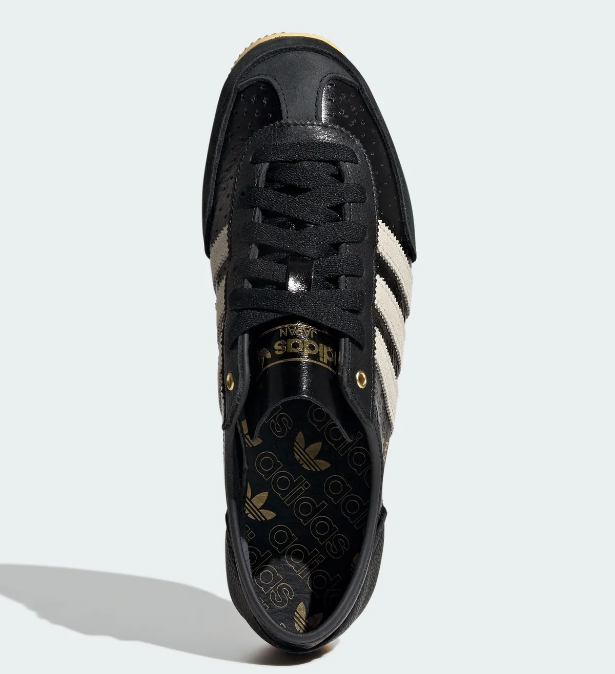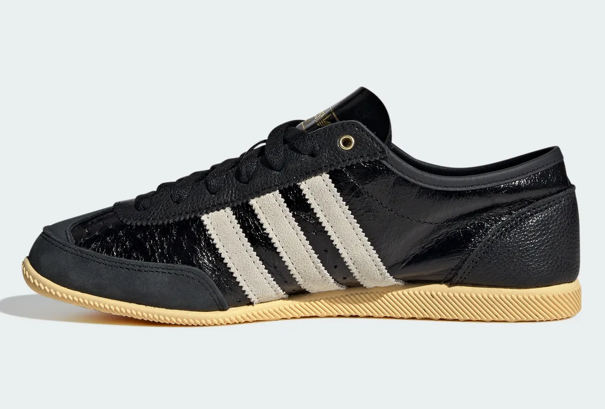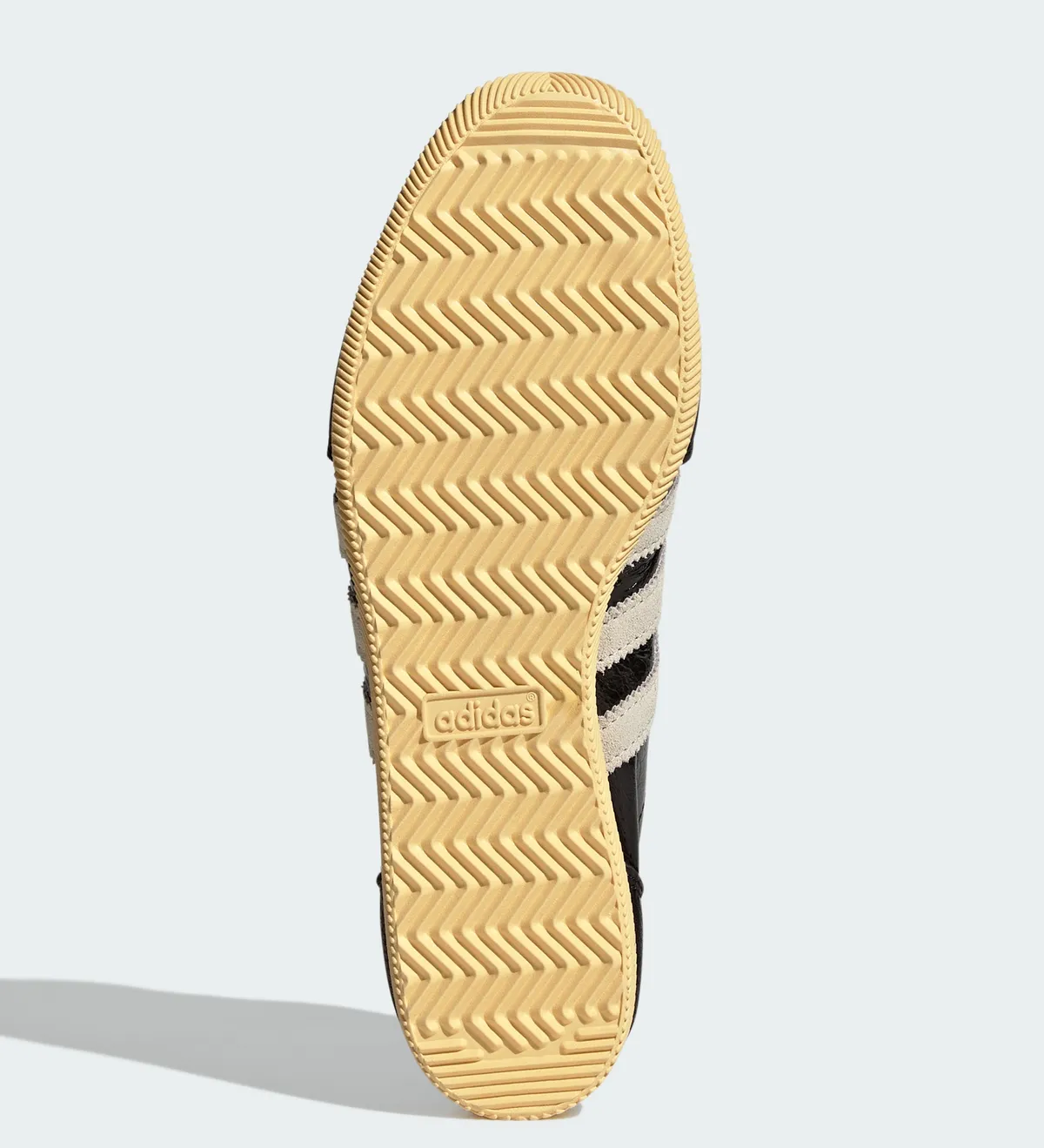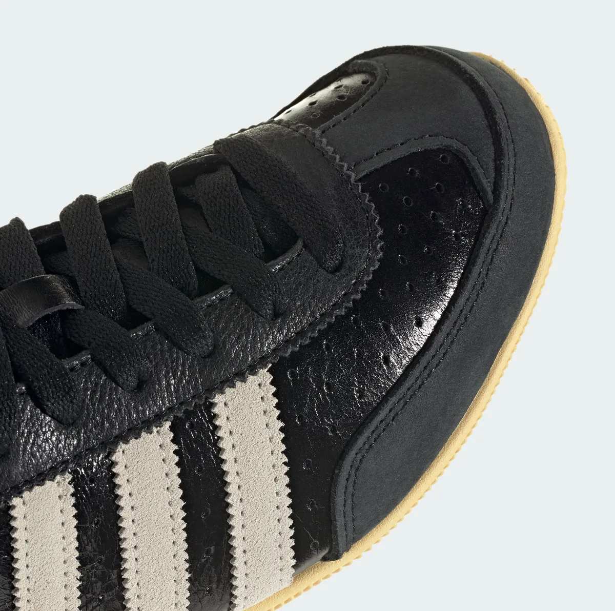 「コアブラック」は深みのある黒のアッパーに淡いストライプが重なり力強さと軽やかさが同居するコントラストが印象的です。光沢を抑えた黒は重く沈まずステッチが規則正しく走ることで革の表情に細い軌跡が刻まれます。淡色のスリーストライプスがその上をすべるように配置されガム風のソールの柔らかな色調と呼応し足元が落ち着いた佇まいへと整えられます。
