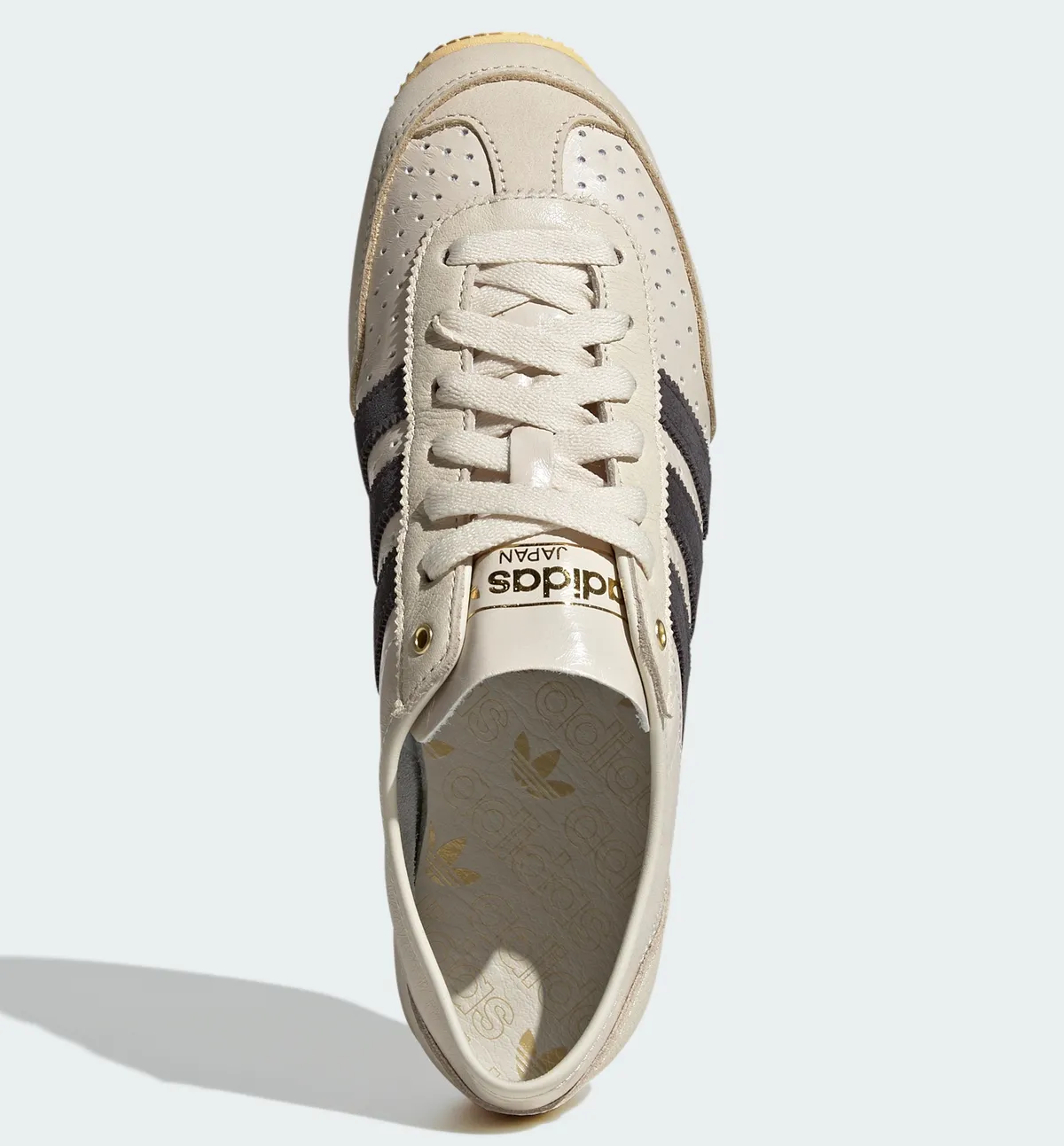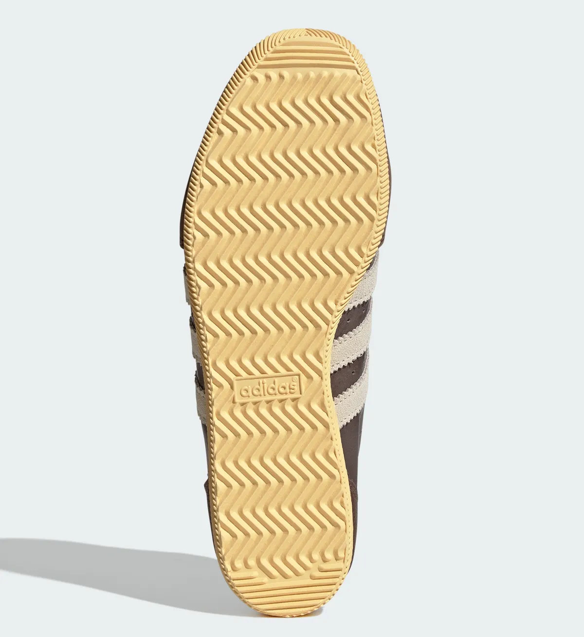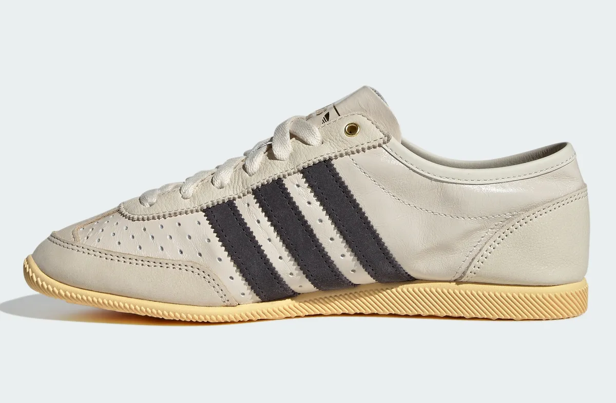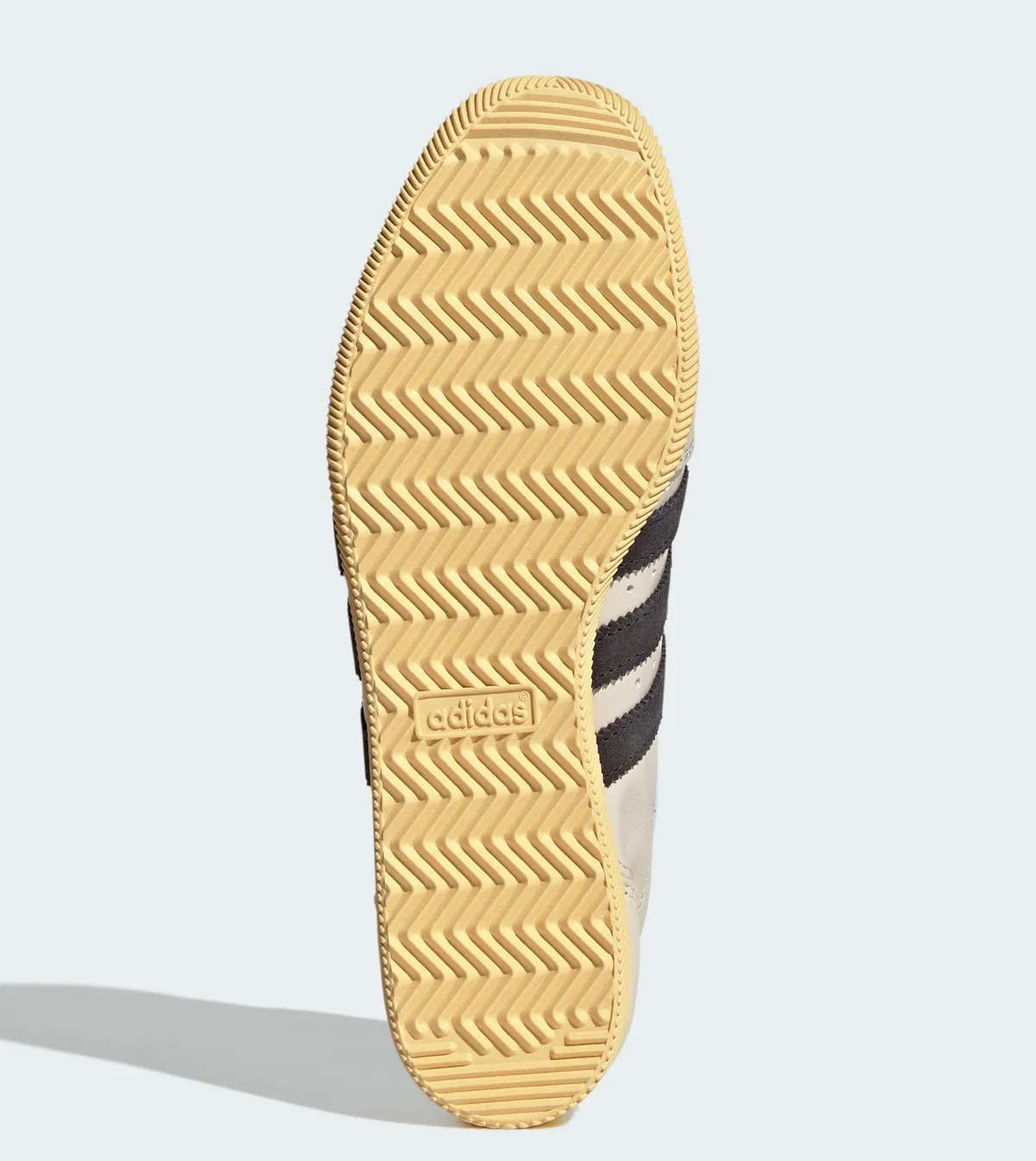 「クリームホワイト」では明るいトーンのアッパーが砂肌のような穏やかな質感を見せます。黒のスリーストライプスが輪郭を引き締め縫い目のひとつひとつが立体的に浮上することで柔和な色調に奥行きを与えます。シューレースやヒールの補強部も控えめな色味で統一され全体を包む静謐さのなかに黄金色のソールが温度をもたらします。