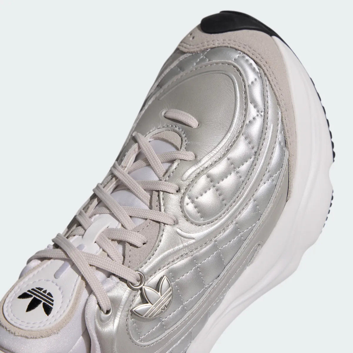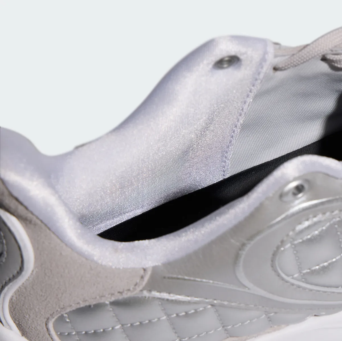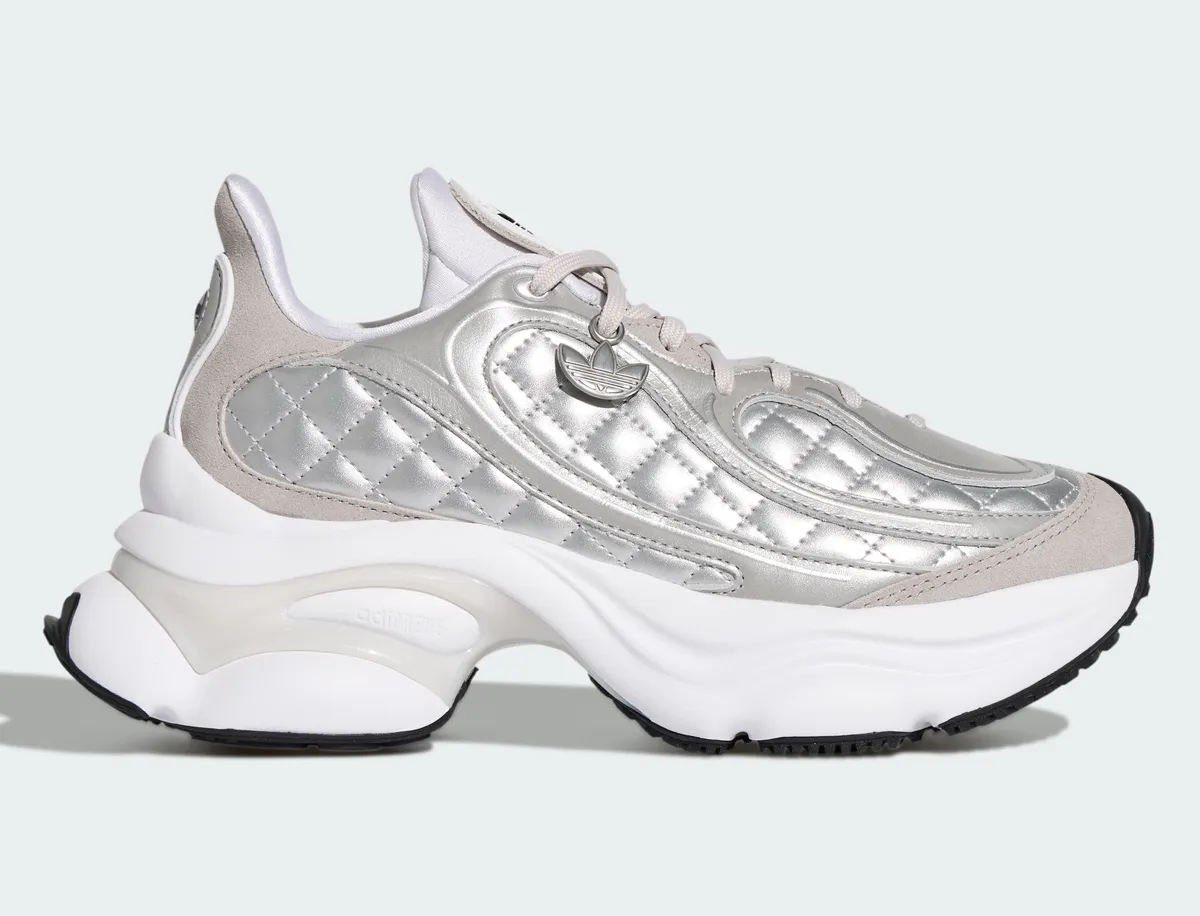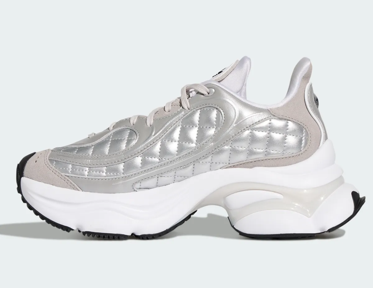 マットシルバーのレザーとテキスタイルが重なり合い波紋のように緩やかなラインを描くパネル配置が立体的な陰影を生みます。金属光沢を抑えた銀色の表情は派手さに頼らず静かな存在感を帯びながら足元に涼やかな透明感を添えます。つま先からサイドへと広がるステッチは均整の取れたリズムで走りアッパー全体を柔らかく包むように形作られています。シュータンにはトレフォイルロゴが控えめに配されホワイトを基調としたレース周りの構造とともに軽快な印象を強めます。