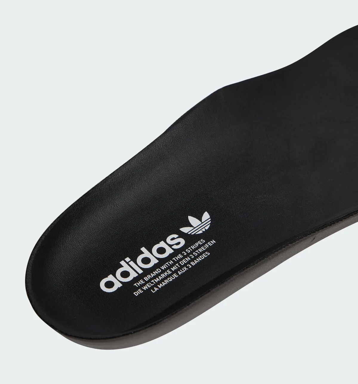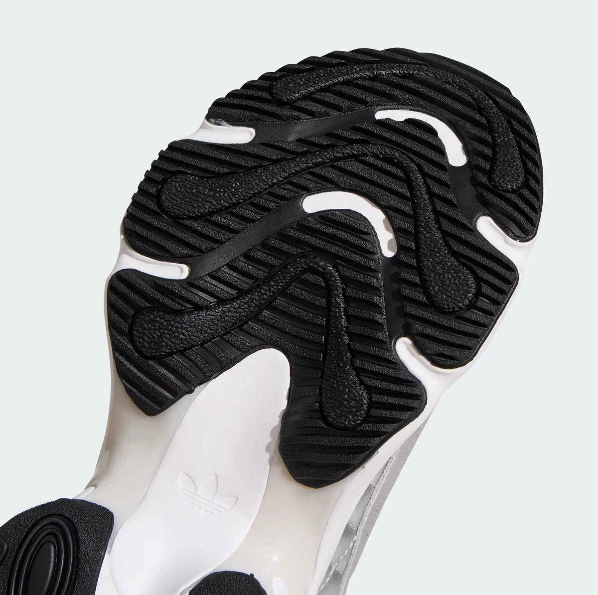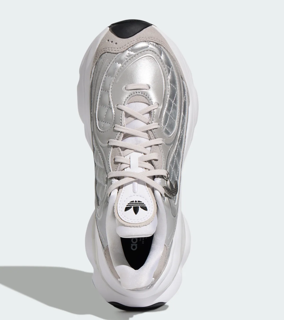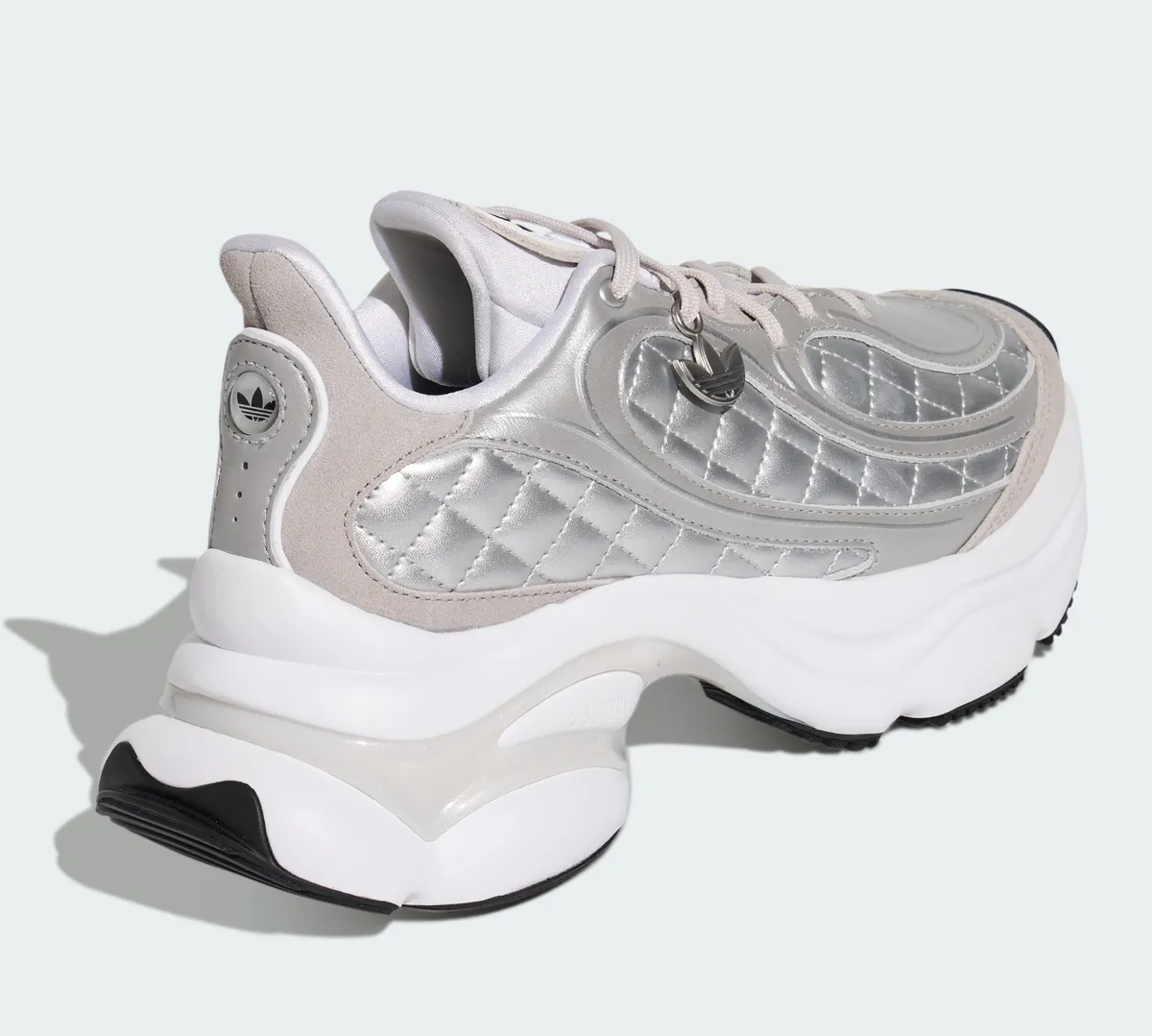 マットシルバーのレザーとテキスタイルが重なり合い波紋のように緩やかなラインを描くパネル配置が立体的な陰影を生みます。金属光沢を抑えた銀色の表情は派手さに頼らず静かな存在感を帯びながら足元に涼やかな透明感を添えます。つま先からサイドへと広がるステッチは均整の取れたリズムで走りアッパー全体を柔らかく包むように形作られています。シュータンにはトレフォイルロゴが控えめに配されホワイトを基調としたレース周りの構造とともに軽快な印象を強めます。