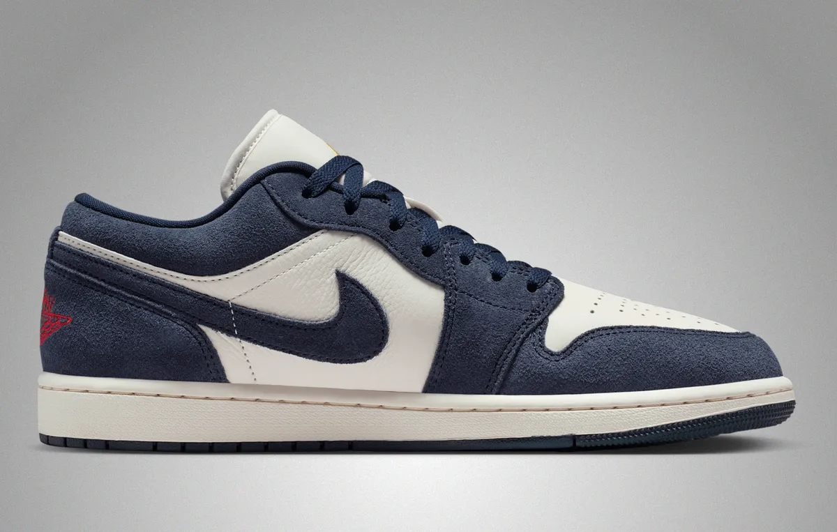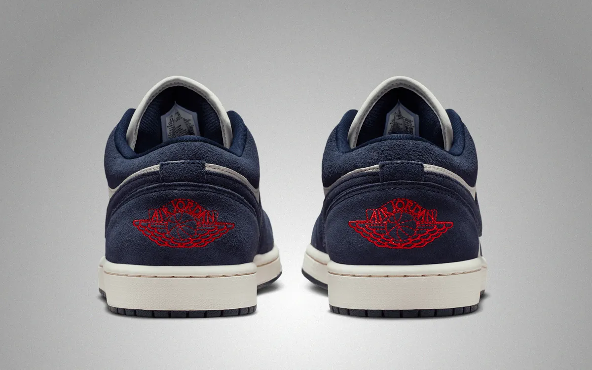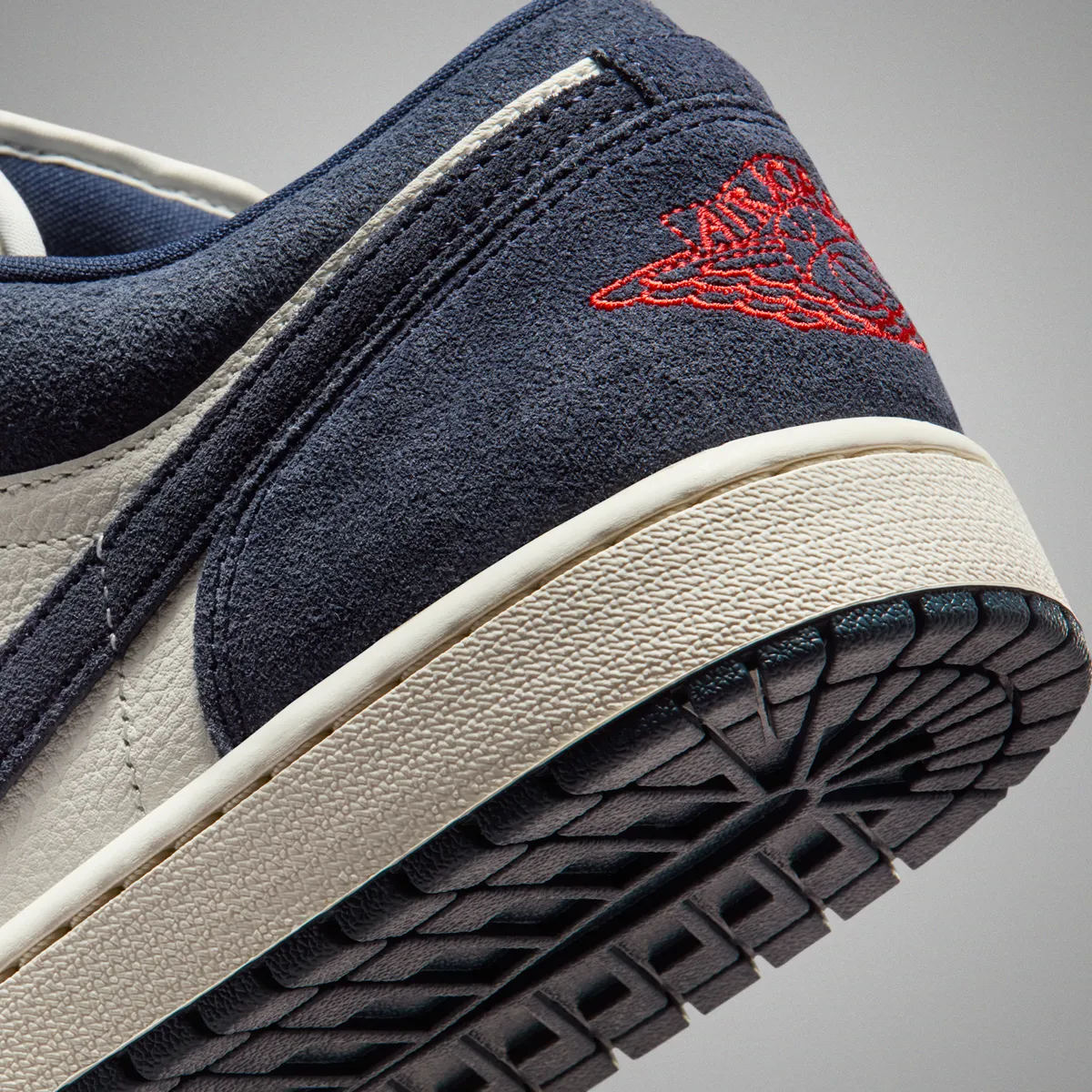 ヒールにはチリレッドのウイングロゴが刺繍され濃紺の包み込むような背景の上で鮮やかに浮かび上がります。アウトソールはオブシディアンでまとめられ深い色調が接地面に落ち着いた印象を与えます。ミッドソールはやや黄味を帯びたトーンで仕上げられヴィンテージライクな空気を漂わせながらも現代的なバランス感覚を保っています。トップビューではネイビーのシューレースとホワイトのレザーの対比が際立ちアッパー全体がリズミカルな構図として視界に収まります。タンにはユニバーシティゴールドのジャンプマンが控えめに輝き配色の中に小さな鮮度を添えます。