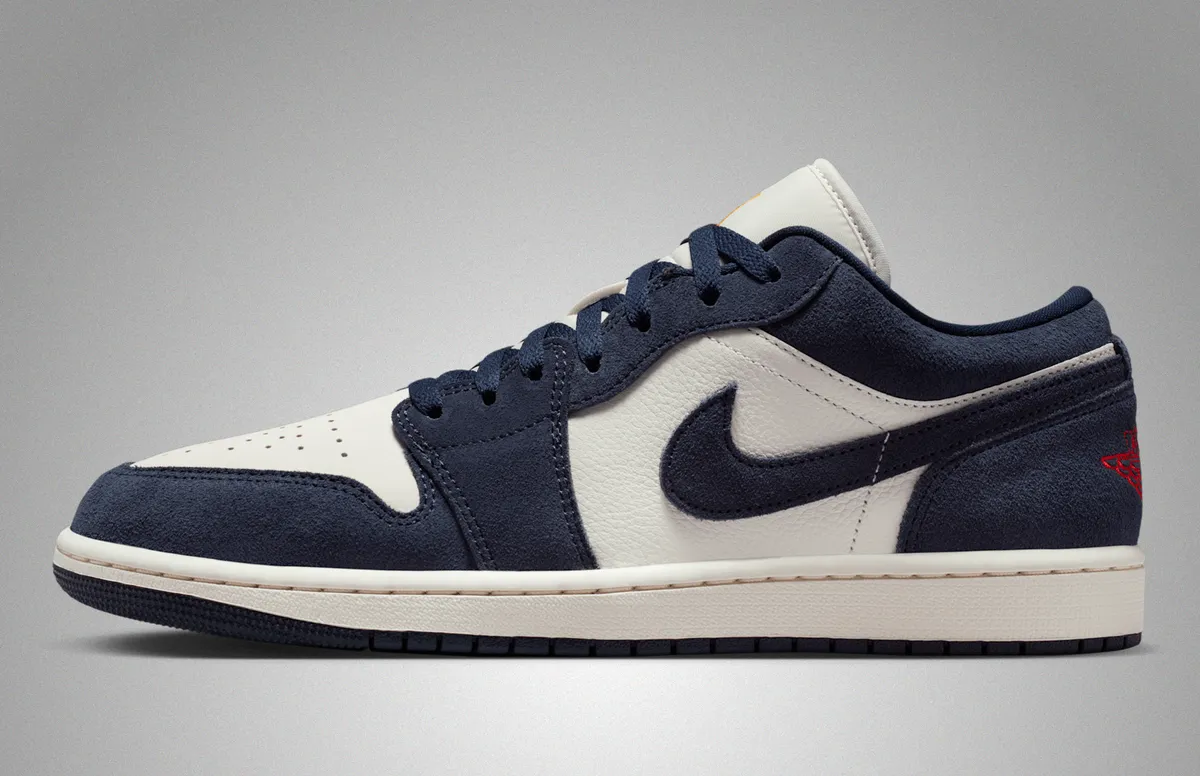 エア ジョーダン 1 LOW SE オブシディアン ユニバーシティゴールドはホワイトを基調としたレザーアッパーにオブシディアンのスエードオーバーレイを重ねた構成が特徴です。
