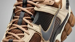 レザーの滑らかな面とスエードの起毛した質感が対話するように並び足元に深みのある表情を与えます。サイドには濃紺のスウッシュが流れるように配され柔らかな陰影を纏いながらシルエットを引き締めます。つま先のパンチングやシューレース周りの切り替えは細部に宿る静かなアクセントとして存在し全体を統一しつつも単調にならない構成を築きます。