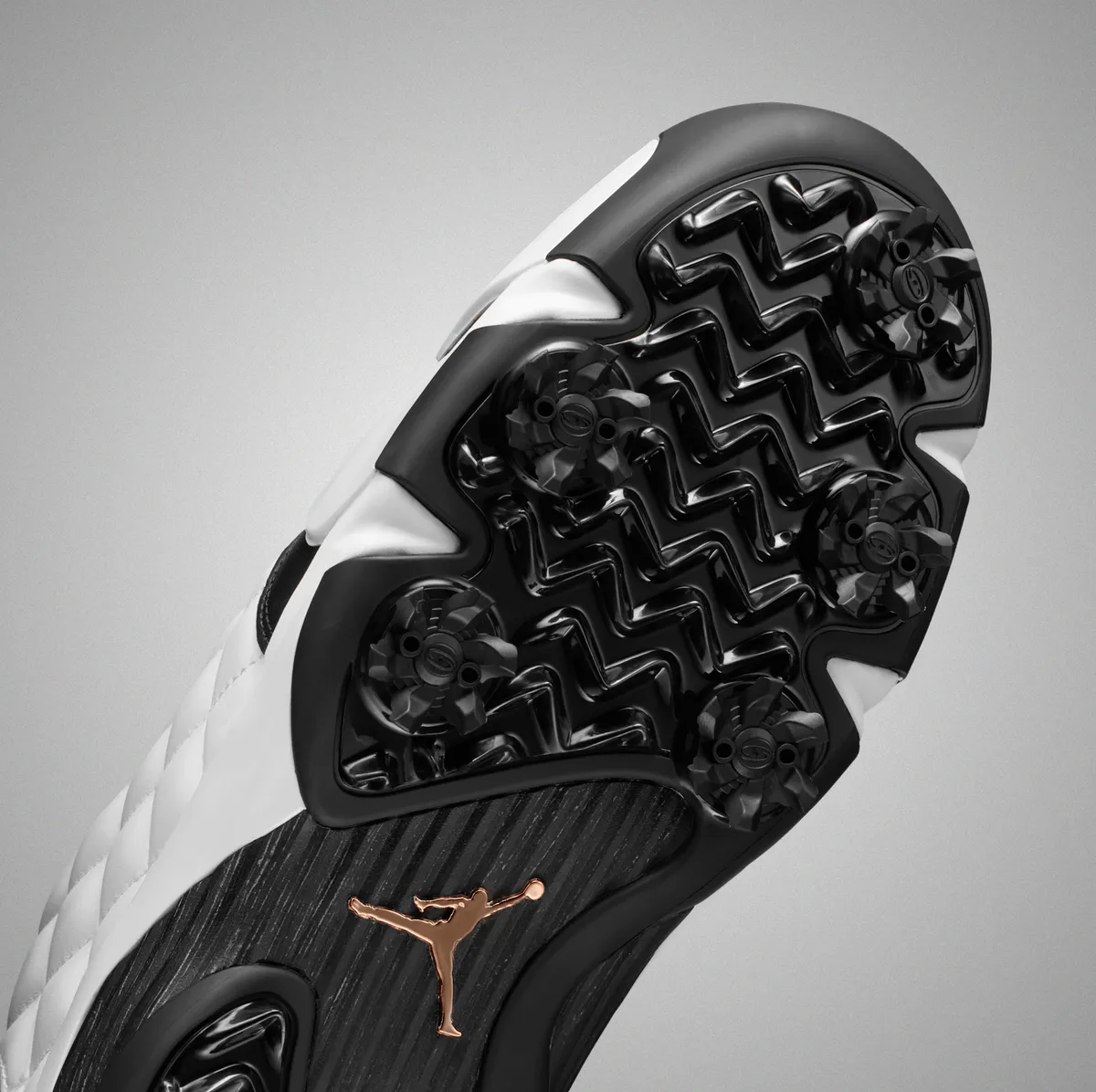 アウトソールは細かな凹凸が重なった複雑な形状で地面をしっかり捉える印象が強く中央には落ち着いたゴールドのジャンプマンが配置されています。ソール裏のパターンは方向ごとに異なるテクスチャーを持ち歩行時のグリップを細やかに補助する構造です。取り外し可能なスパイクは7本の配置で硬質プレートに固定され芝に対して鋭く噛み込むような存在感を放ちます。