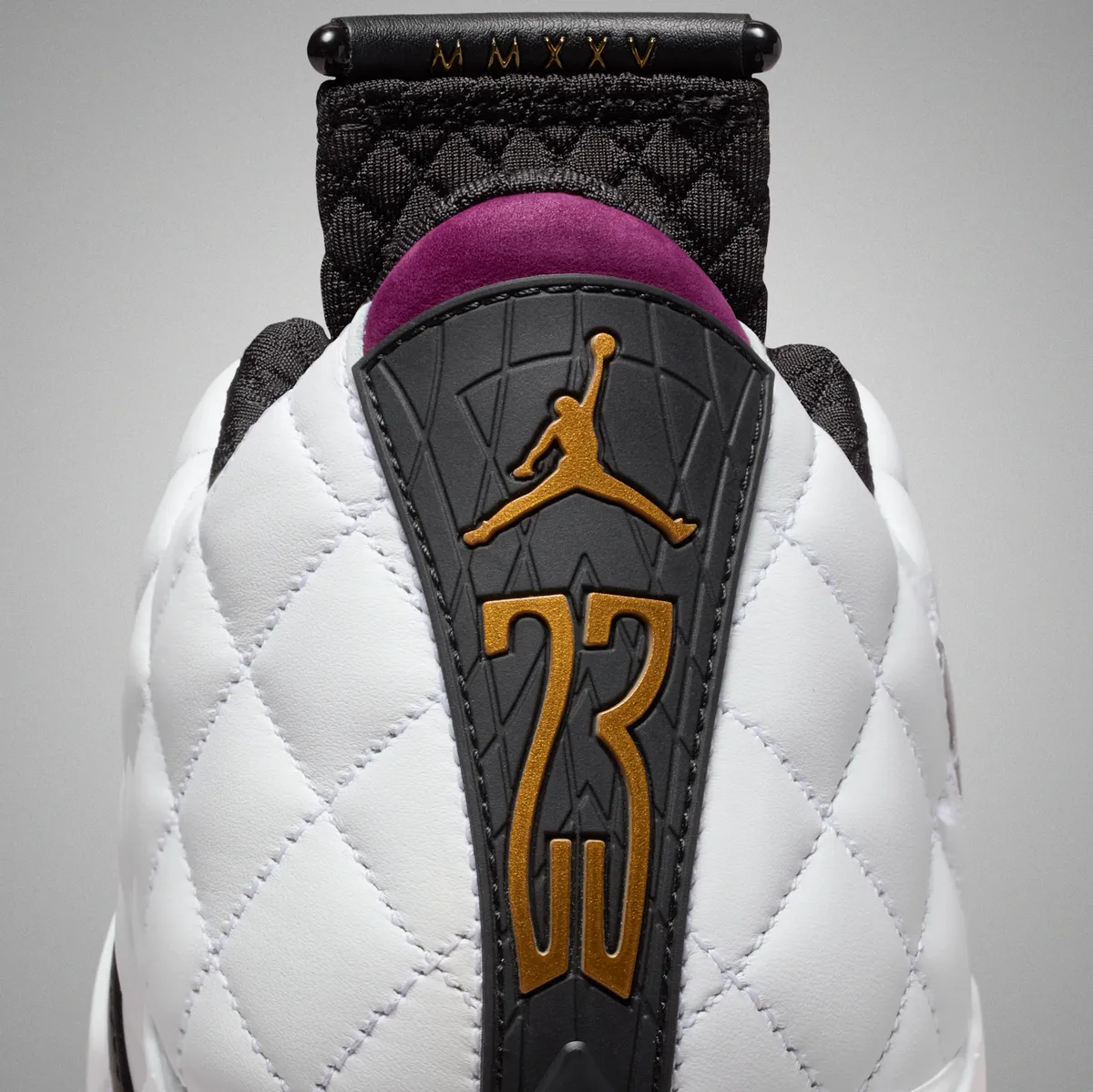 ミッドソール内部には前足部とヒールにAir Zoomユニットが組み込まれ踏み込みやスイングの際にしなやかに衝撃を散らす設計です。足入れ口周辺にはボルドーが差し込まれ黒のパーツと重なり合うことで奥行きが生まれ視線が自然とヒールへと誘導されます。ヒールに刻まれた「23」とジャンプマンの組み合わせは立体的で重厚感を帯びながらも過度にならない絶妙なバランスで配置されています。