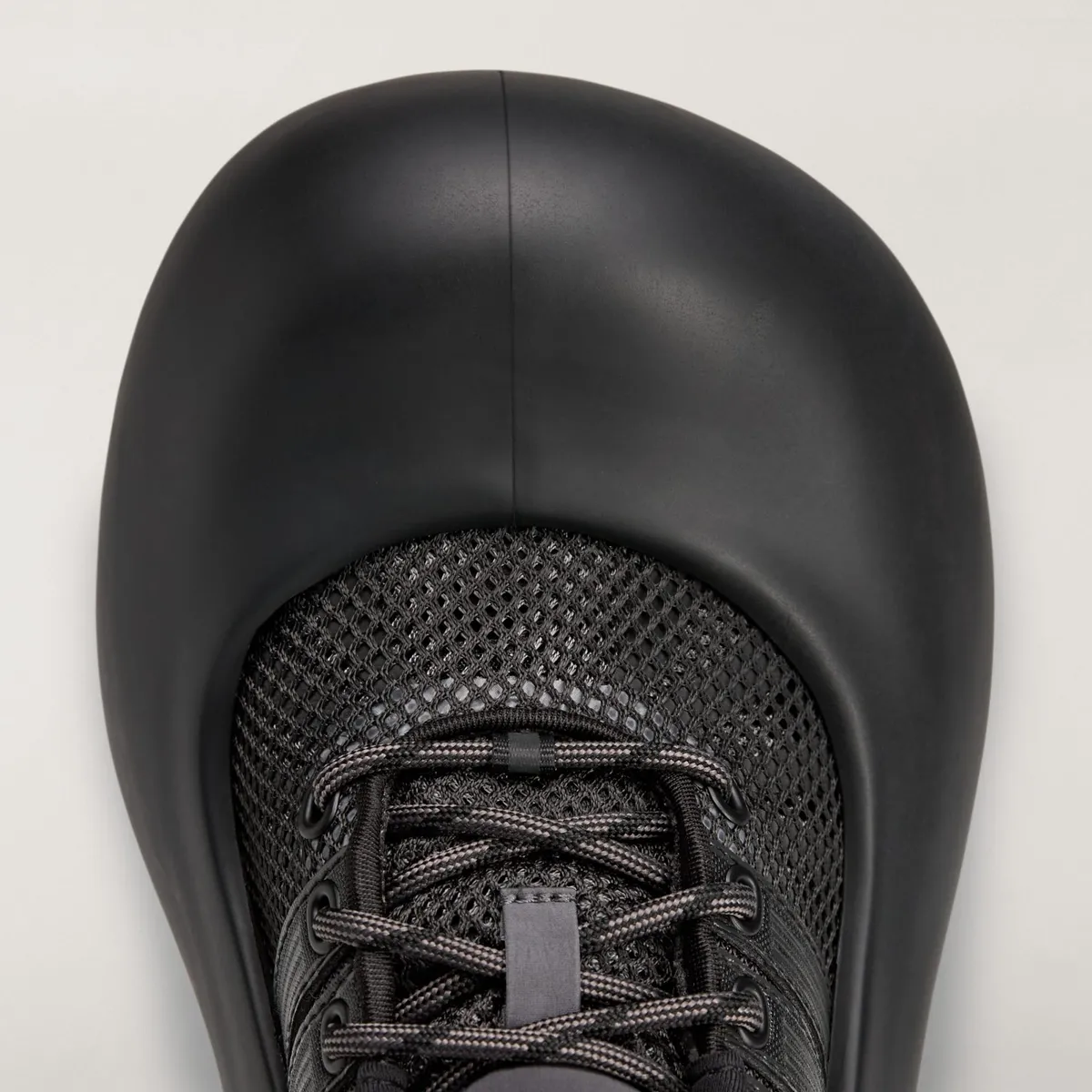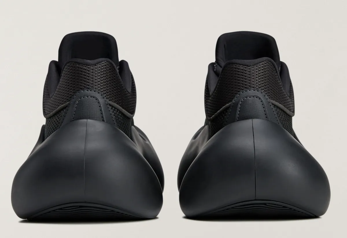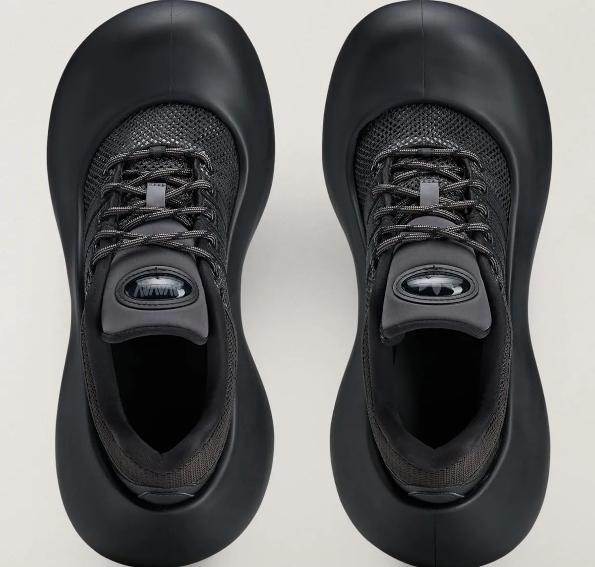 まず目を引くのはその異形ともいえるフォルムです。ソール全体を覆うように膨らんだミッドソールはまるで流体が凝固したような立体感をもち足元に重力の感覚を曖昧にする浮遊性を与えています。曲面で構成されたシルエットは彫刻的でありながら黒一色で統一されることで過剰さを抑え静謐な緊張感を漂わせます。アッパーにはメッシュと合成素材を組み合わせ柔軟性と通気性を確保しながら密度の異なる編み構造が繊細な陰影を生み出しています。