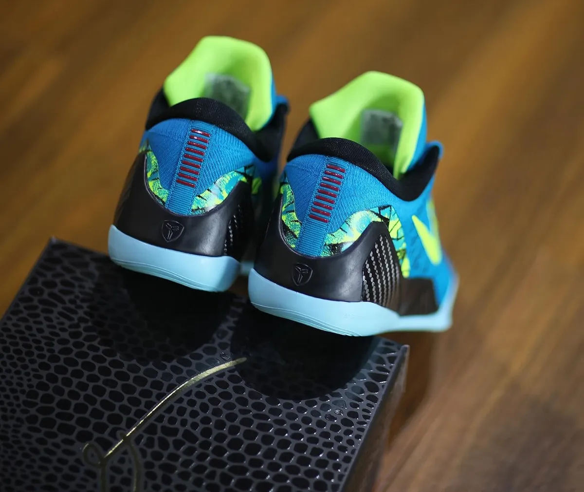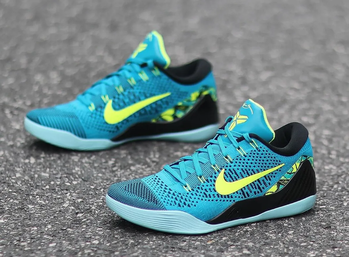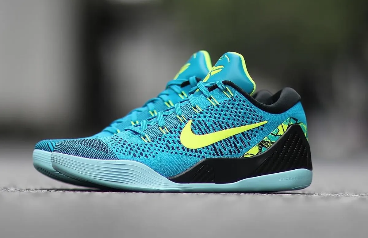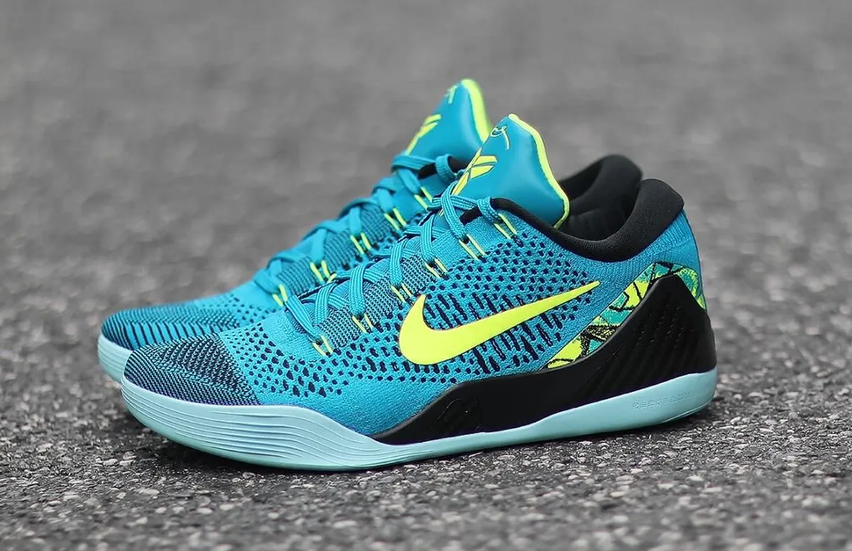 ナイキ コービー 9 エリート LOW プロトロ “ネオターコイズ/ボルト”は比類なき完成度で知られるコービー・ブライアントのシグネチャーシリーズの中でも特に造形美と機能性が溶け合った一足です。