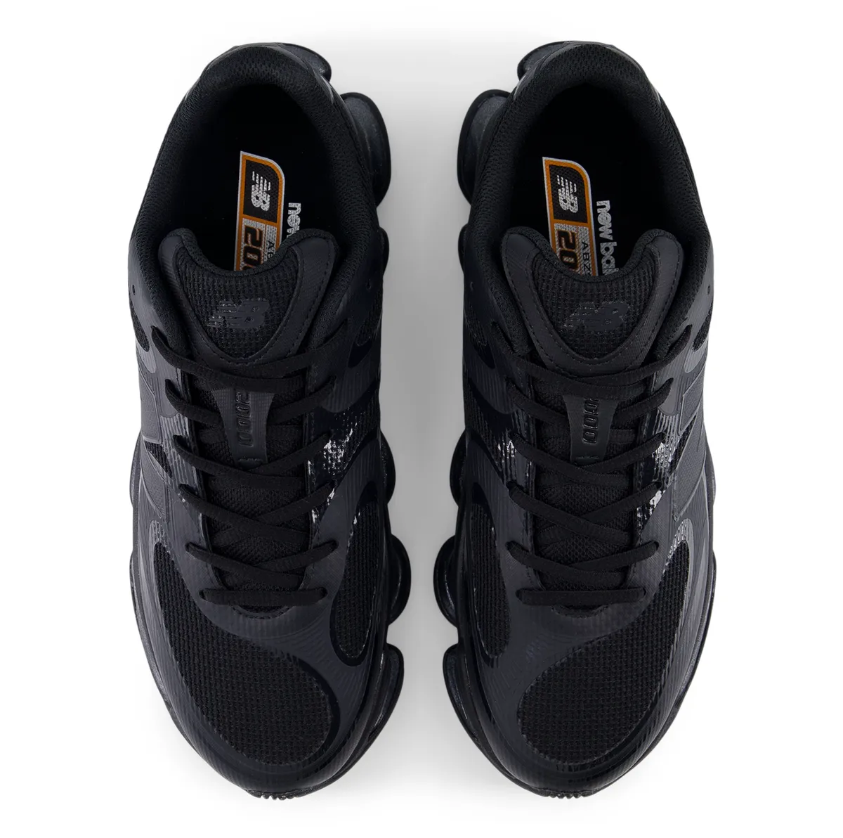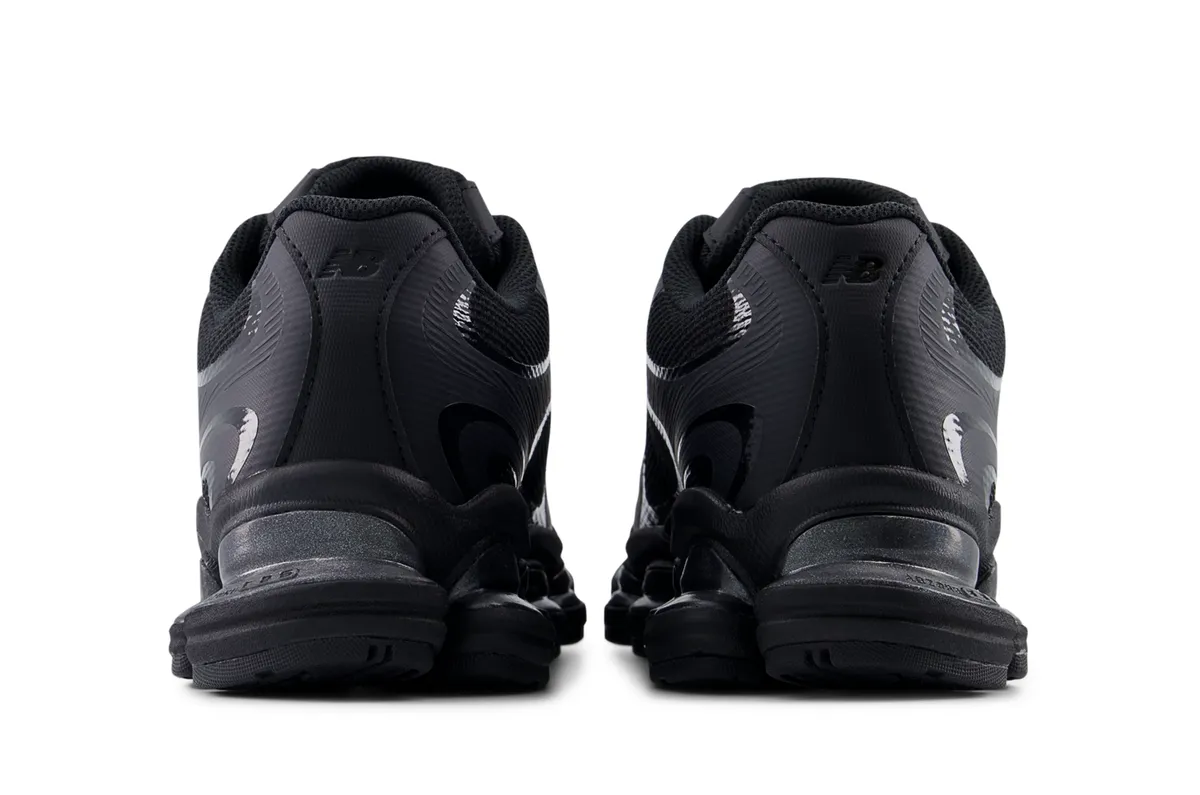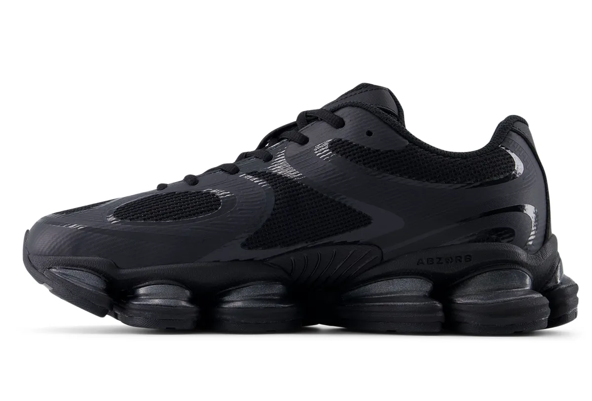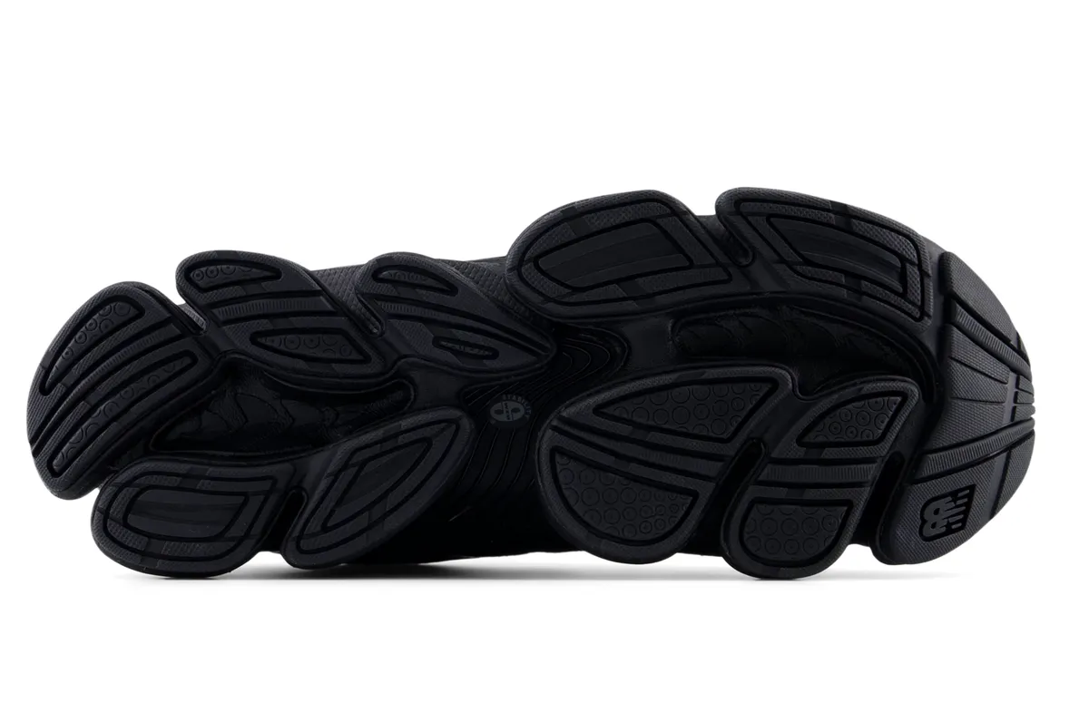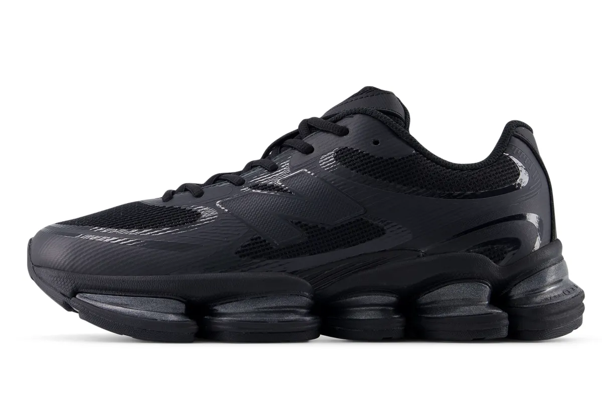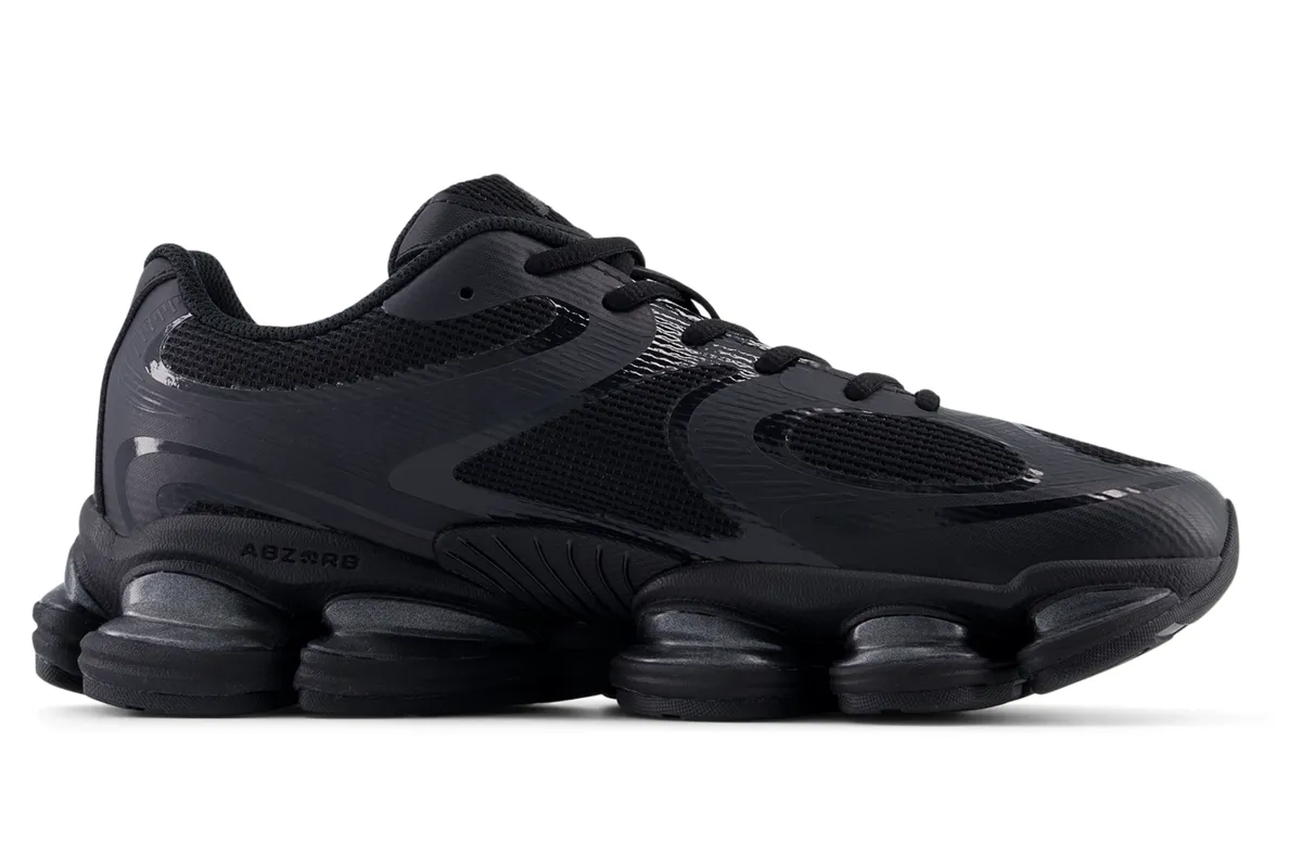 全体を覆うディープブラックのアッパーはメッシュとシンセティックレザーが緻密に組み合わされ陰影を纏うような立体感を生み出しています。マットな質感のパネルとわずかに光を拾うグロス仕上げのパーツが交錯し黒という単色に深さと緊張感をもたらしています。どの角度から見ても無駄のないラインが流れ足元に鋭い輪郭を描き出します。