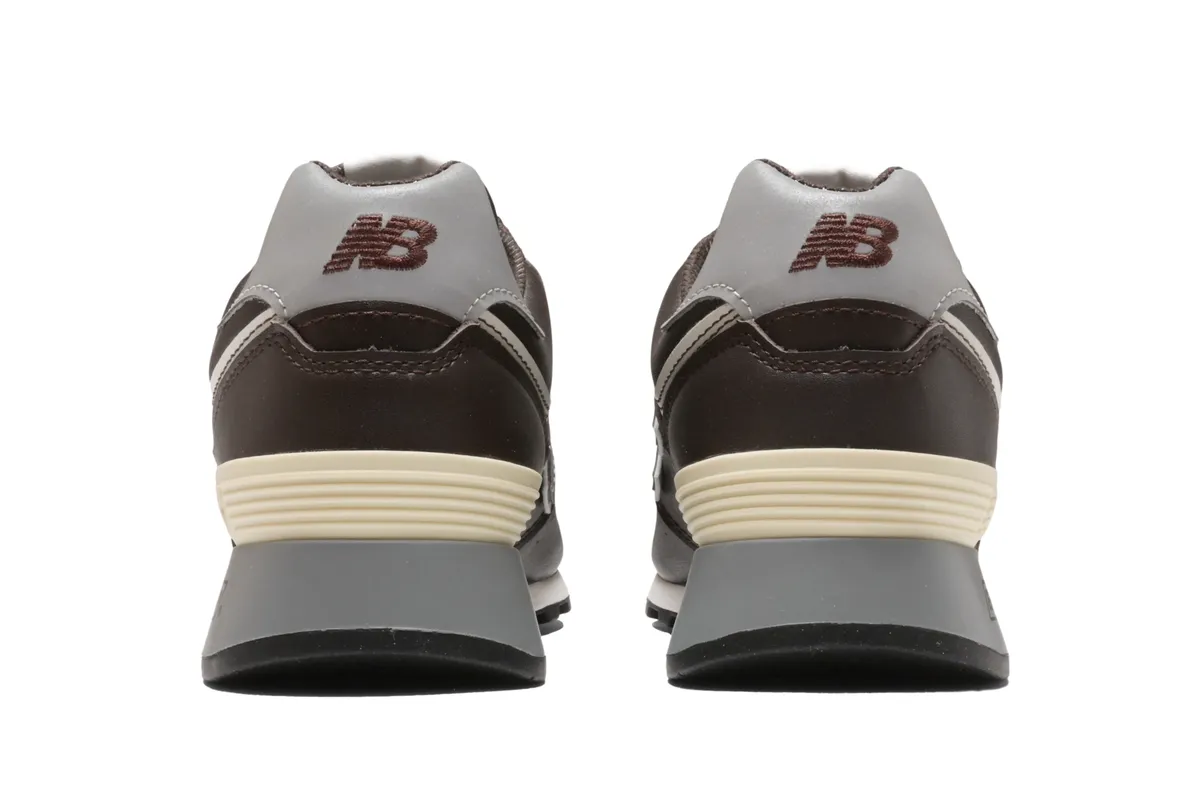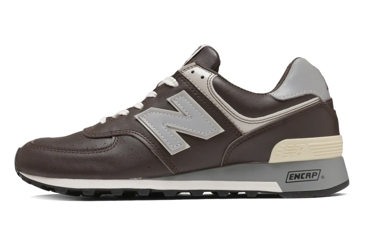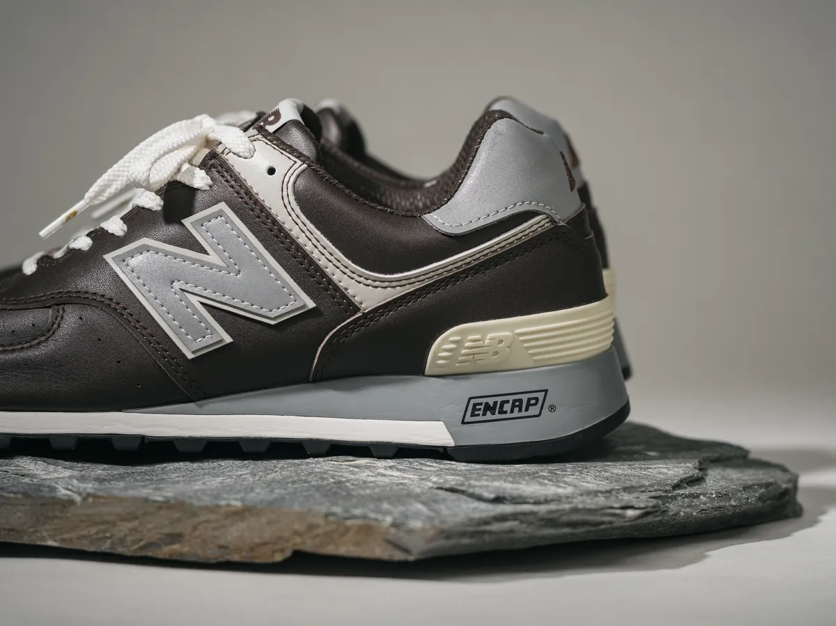 サイドから眺めるとSL-2ラスト特有の丸みを帯びたフォルムが際立ち前足部へなめらかに流れ込むラインがその柔和なシルエットを強調します。ミッドソールにはENCAPが組み込まれ淡いベージュがブラウンの濃度を和らげるように層を描き視覚的な安定感も演出しています。アウトソールは重厚なブラックでまとめられ凹凸の深いパターンが存在感を静かに放っています。背面から見るとヒールの曲線が自然に立ち上がりブラウンとグレーの切り替えが品格ある調和を見せ刺繍された「576」の数字がアクセントとして浮かび上がっています。