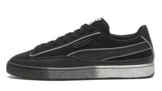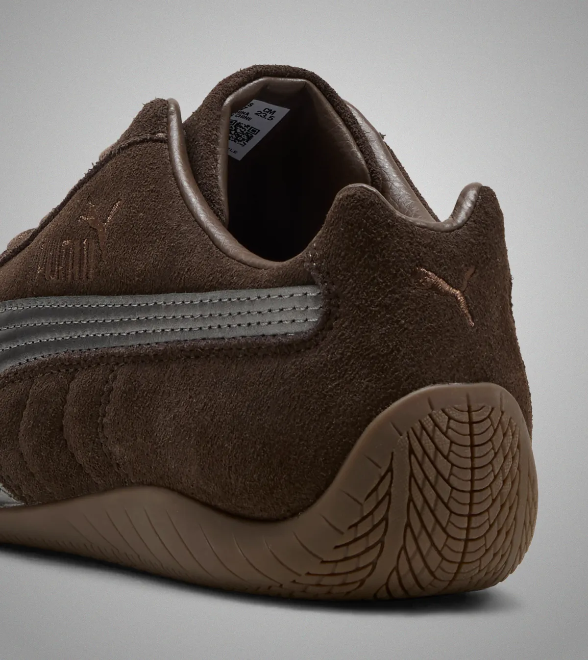 タンにはブランドロゴ刺繍が施され、ブラウンのシューレースは素材感と調和しアッパー全体に自然な一体感を与えています。インナーには落ち着いた色調の素材が用いられ足入れの瞬間に包み込まれるような滑らかさが伝わります。側面にはプーマキャットの刺繍が控えめに配置され過度に主張することなくモデルの静かな存在感を底支えしています。遠目には渋く近づくと繊細さが浮かび上がる層のような深みを持つ表情がこのカラーリングの魅力となっています。