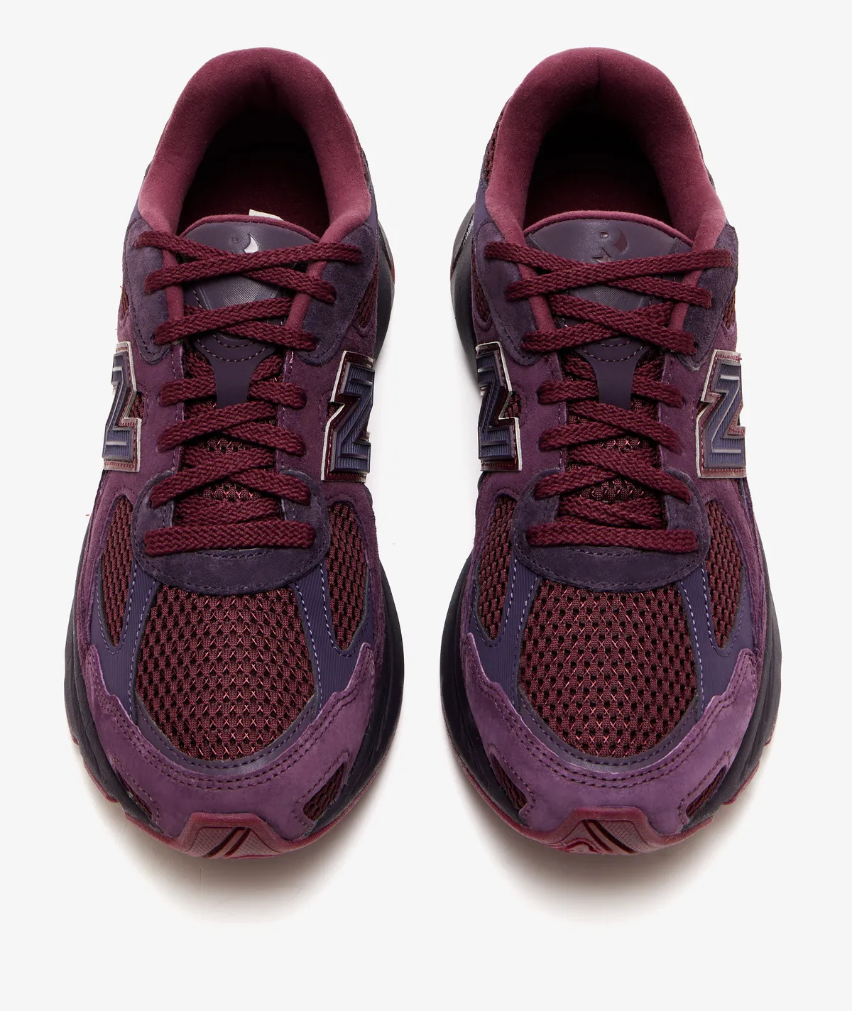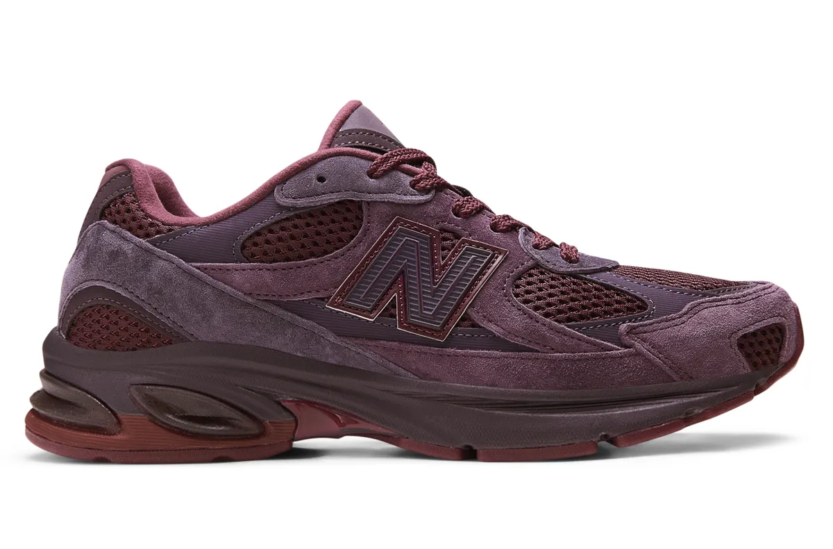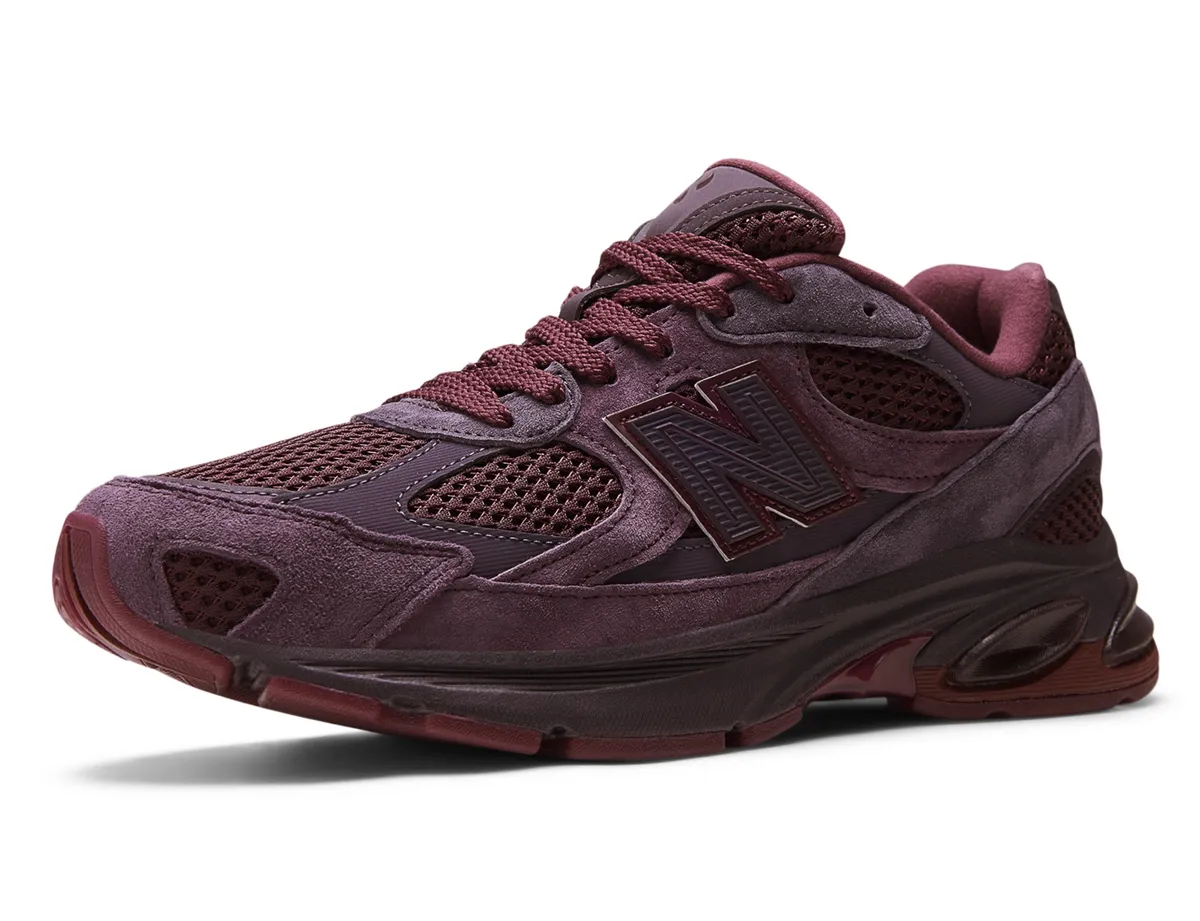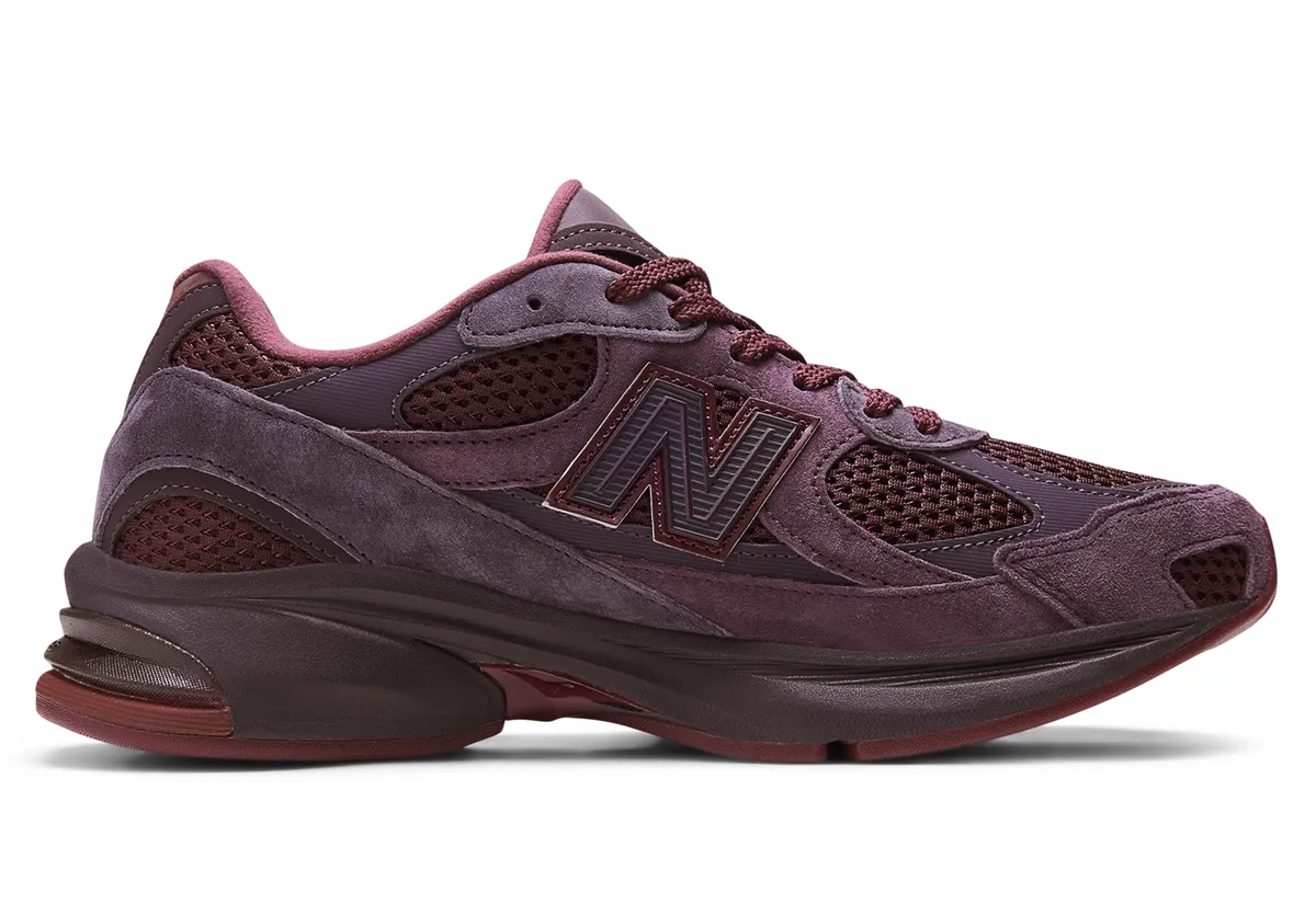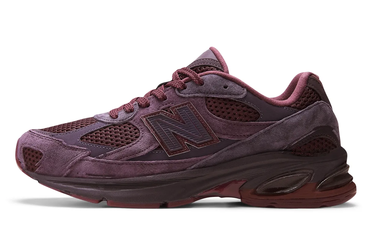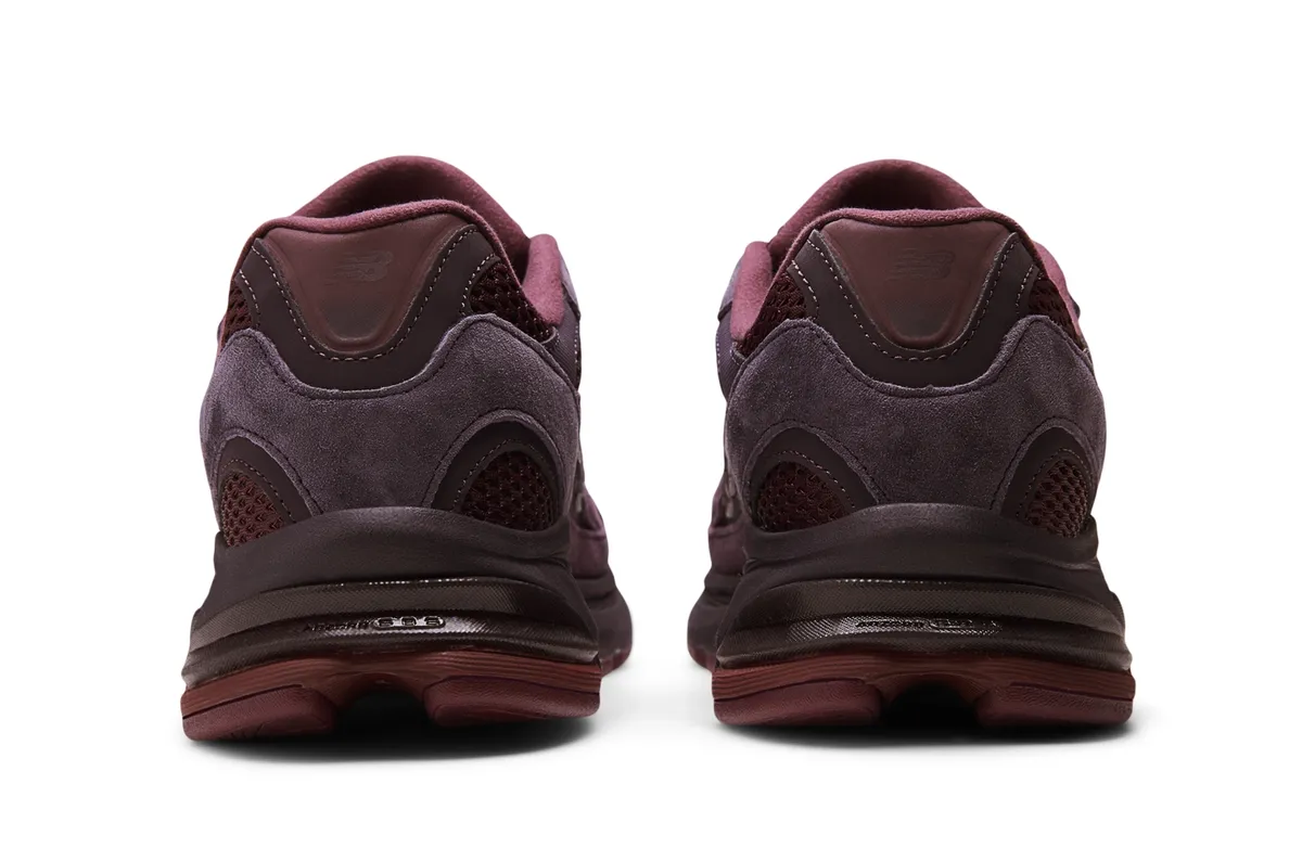 アッパーには複数のパープルトーンが折り重なりスエードとメッシュが織りなす質感の対比が印象的です。柔らかく毛足の長いスエードがフレームのように全体を包み込みその内側に張り巡らされたブラウンメッシュが通気性と奥行きを生み出します。部分的に配置されたシンセティック素材は光を受ける角度によって微妙に異なる陰影を見せ構築的なフォルムをより際立たせます。シューレースにはワインを思わせる深紅が採用され上品さと強さを同時に感じさせます。