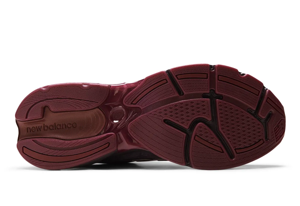 サイドの「N」ロゴはブラウンとパープルのグラデーションで縁取られ全体のトーンを緩やかに結びつけています。ソールユニットは黒に近いディープグレーで構成されアッパーの色調をしっかりと受け止める土台のように機能します。アウトソールにはバーガンディが差し込まれ歩くたびにわずかに覗く色の層が動きのリズムを作ります。タンには控えめな“R”ロゴが刻まれリッチ・ポールの個性を象徴するディテールとして静かに主張しています。上から見たときのシルエットは滑らかでやや幅を持たせたボディラインがクラシックな990シリーズを思わせつつもより現代的な印象へと昇華されています。