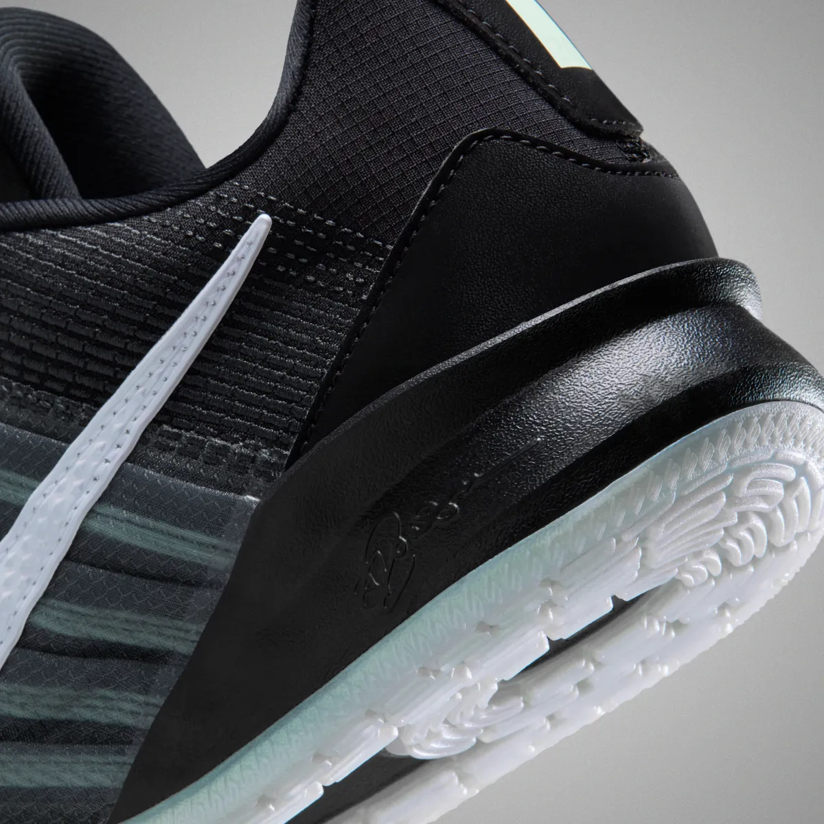 アッパーはブラックを基調にダークスモークグレーとアイアングレーが層を成すように重なり編み込まれたテキスタイルの密度が細やかな表情を見せます。つま先からサイドへと流れるラインは滑らかでまるで影が滑り落ちるような柔らかなグラデーションを描きます。