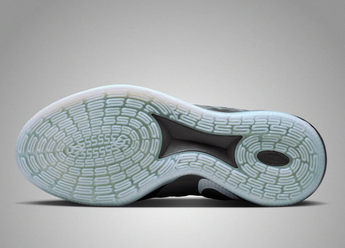 ヒールには硬質な黒のパネルが配され縦に伸びるバー状のデザインが直線的なリズムを生みます。アウトソールは淡いグレーブルーのトーンが敷かれ緻密なパターンが幾重にも刻まれています。その模様は波紋のように広がり安定性としなやかな接地感を視覚的にも想起させます。トップビューではシューレース周囲の幾何学的な配置が際立ちアスリートのために整えられた精密機器のような緻密さを感じさせます。