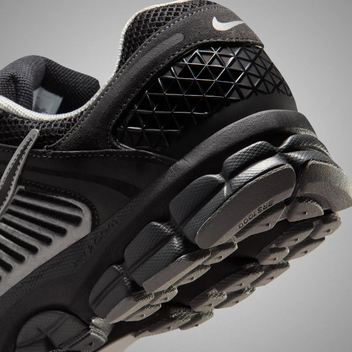 ナイキ ズーム ボメロ 5 アンスラサイト クロムは層状に組み合わされた素材が複雑な質感を描き出す一足です。