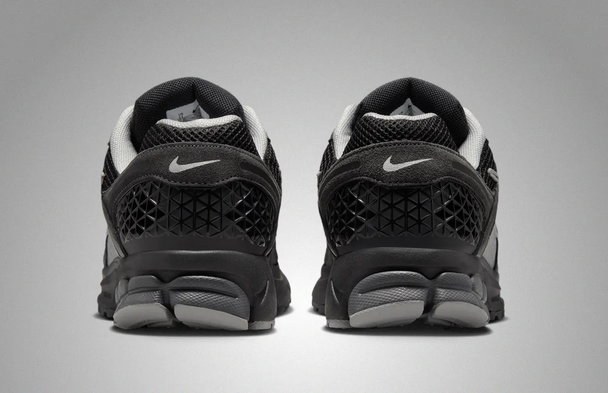 アンスラサイトを基調とするアッパーは細密なメッシュと耐摩耗パーツが交互に現れ濃淡の揺らぎが立体的な表情を生みます。サイドを走るシルバーのスウッシュは落ち着いた光沢をまとい無彩色のバランスに冷ややかな金属感をそっと滑り込ませます。