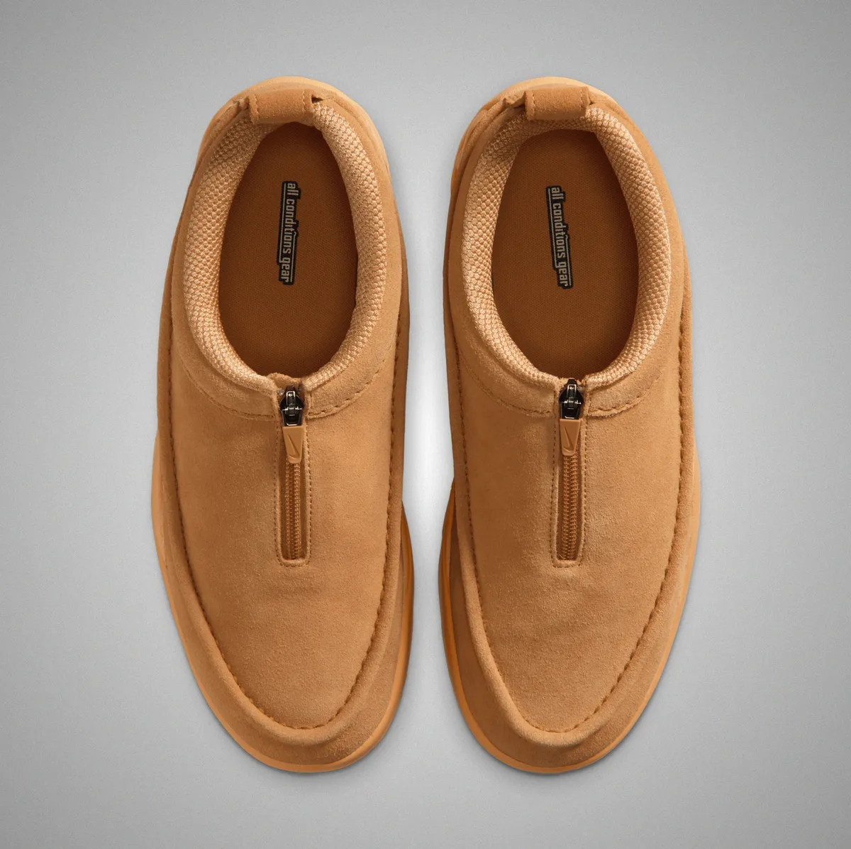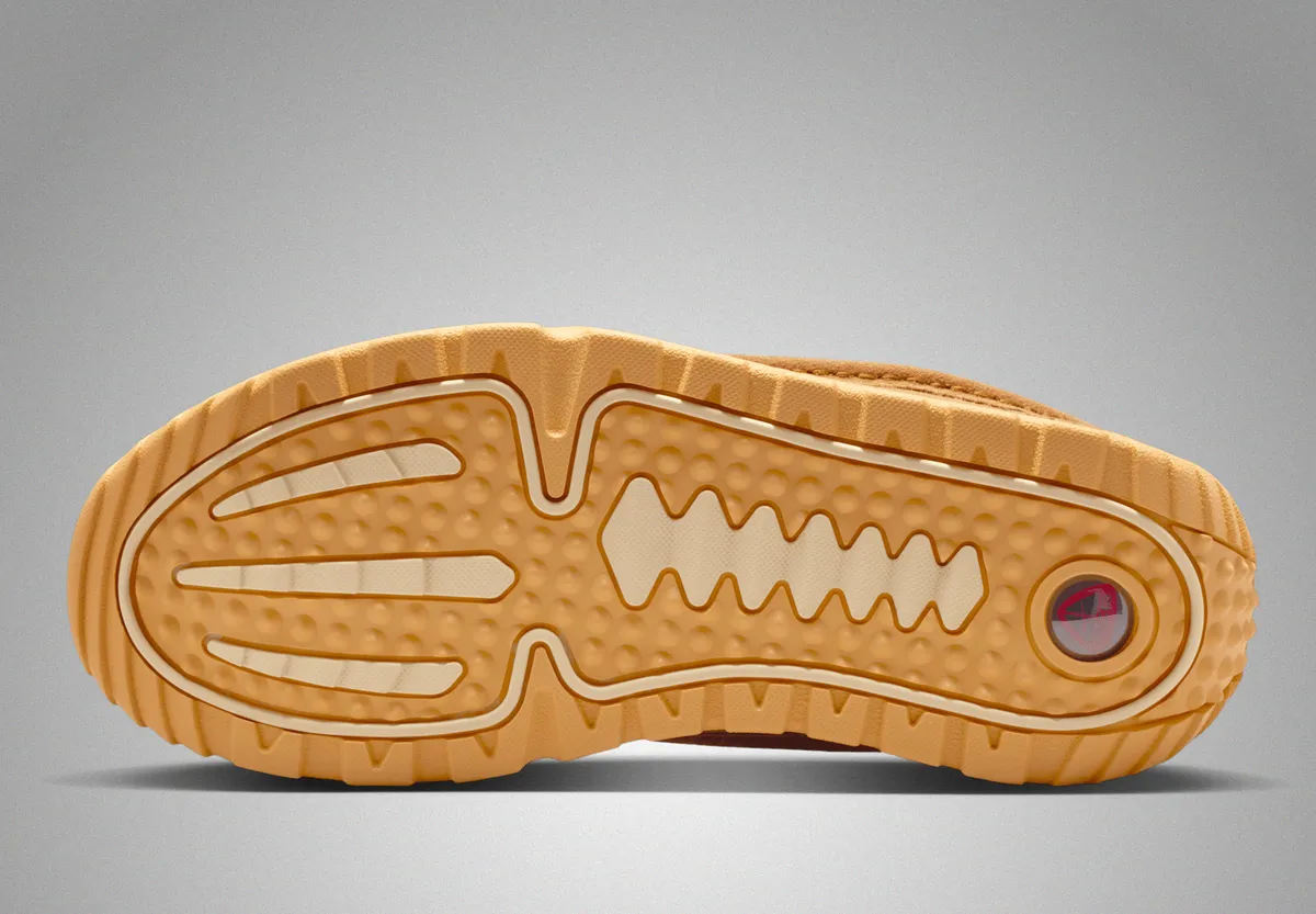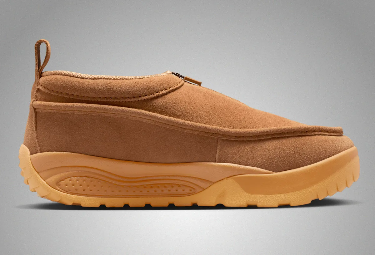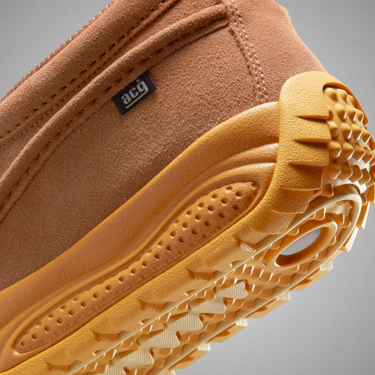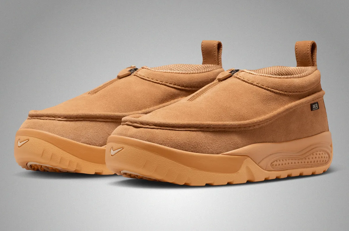 ウィートの濃淡を基調に滑らかなスエードと起毛したテキスタイルが重なり合う層のある表情です。アッパーは柔らかな粒立ちを持つスエードが主役となり履き口周辺のふくらみのあるパッドが包み込むような存在感を添えます。中央に走るジップは装飾を排し滑走するように真っすぐ伸びるラインで全体のフォルムを引き締めています。サイドにはACGロゴの小さなタグが控えめに配され温かみのある色調の中に確かな機能性の気配が漂います。