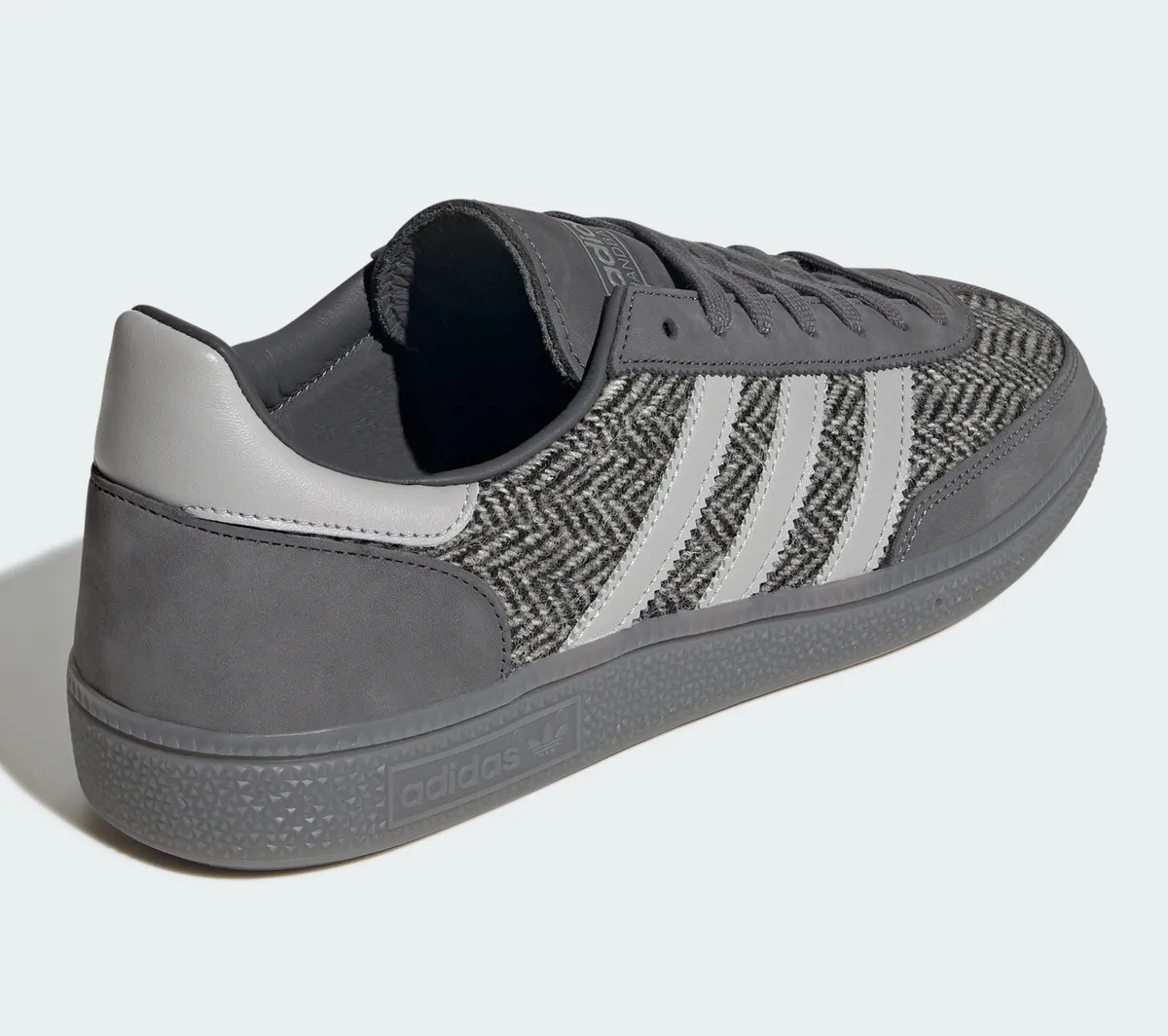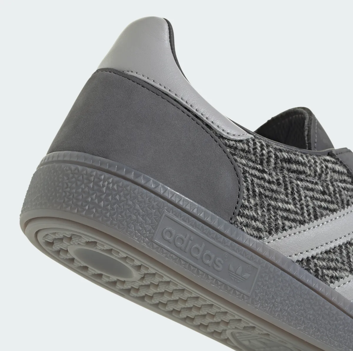 シュータンシューレースアウトソールまでトータルにグレーで統一されている一方かかとのヒールタブに配置されているソフトな質感のパーツは若干の光沢を持ちスエード調のパネルと対比的に映ります。サイドのステッチや縁取りにも精緻な技術を感じさせアディダスのクラフトマンシップが細部にまで息づいています。