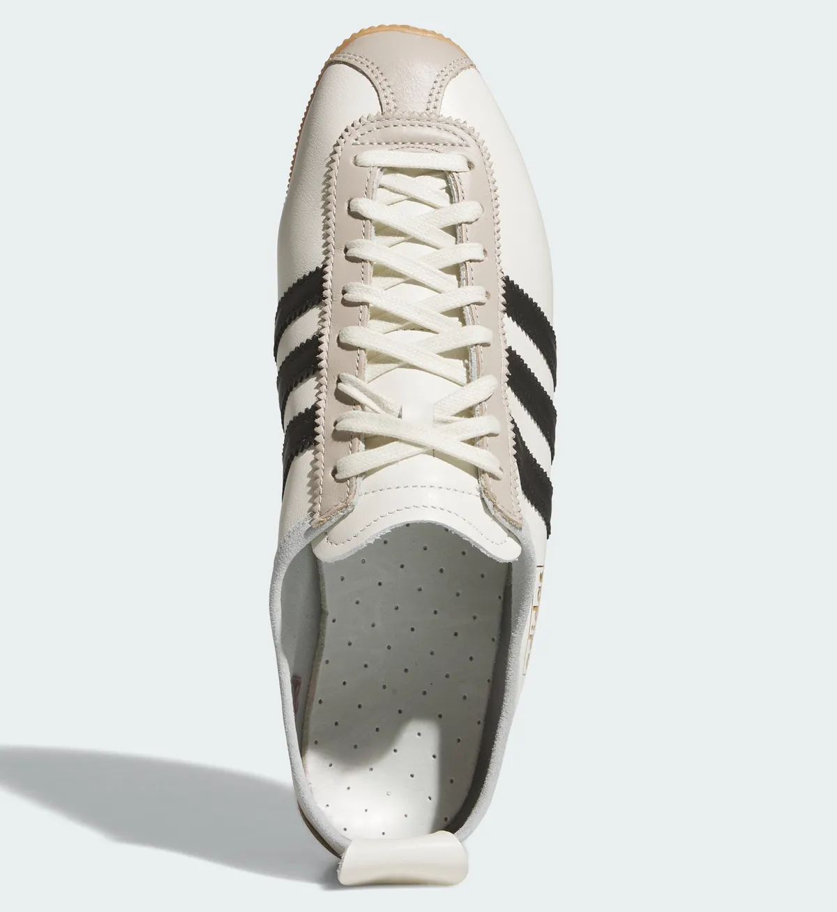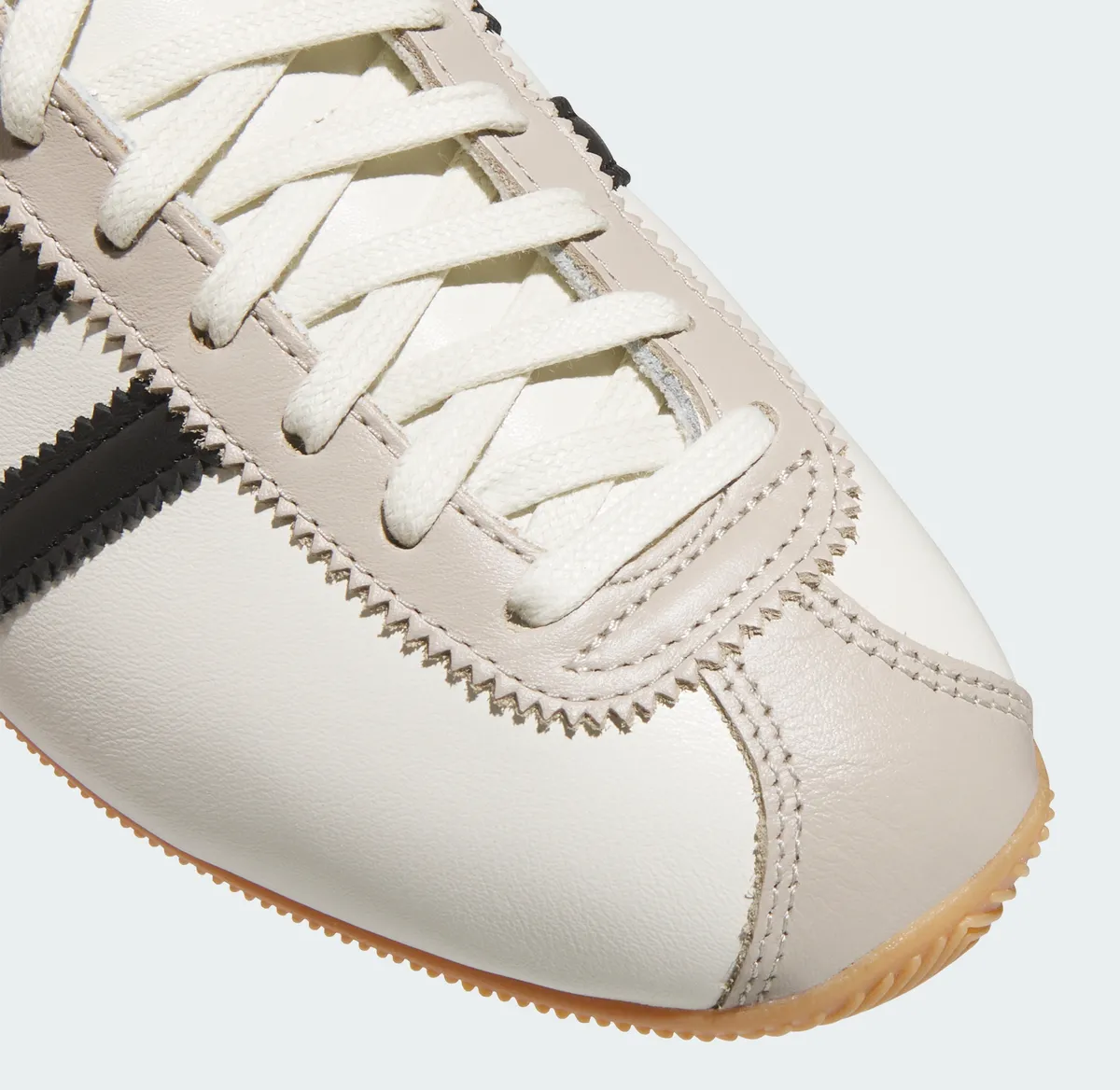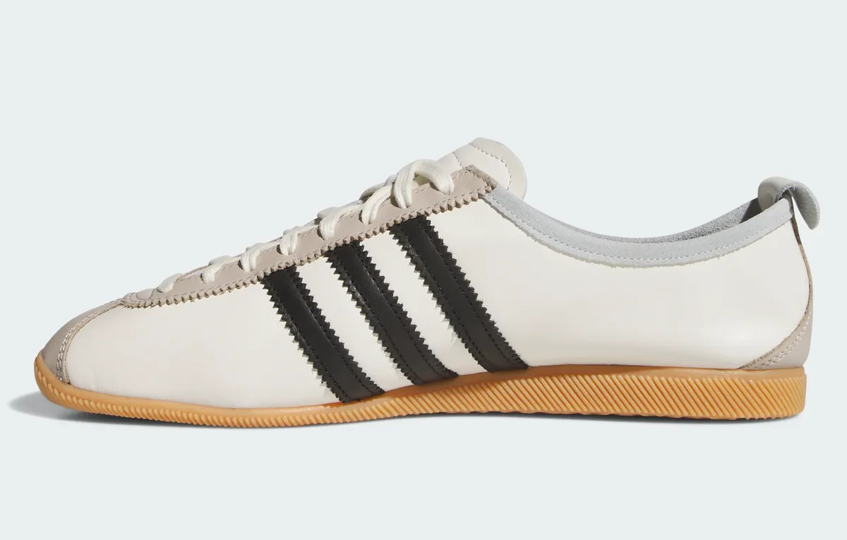 まず目に入るのは繊細に設計されたオフホワイトのアッパーとそれを引き締めるコアブラックのサイドストライプです。アッパーは滑らかな質感でマットな光沢が控えめながらも上品に映ります。その周囲を走るダブルステッチがシューズ全体に立体感を与え外側サイドの金箔ロゴがアクセントとなっています。アイレットからつま先まで延びるレース部は丈夫な作りで同色のシューレースが全体の統一感を損なうことなく配置されています。