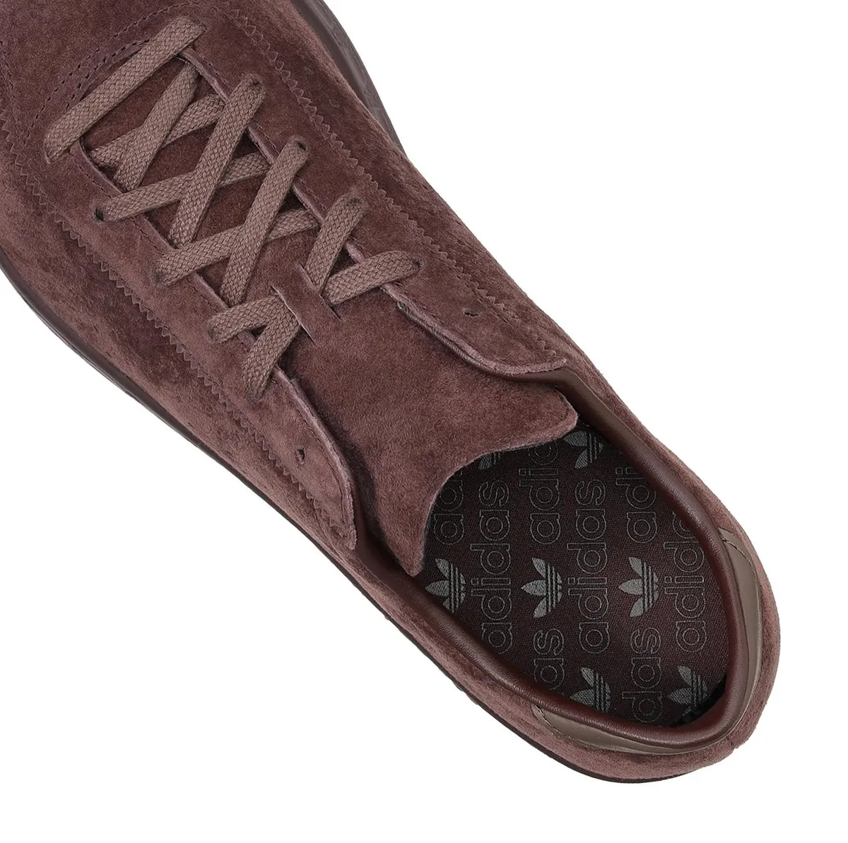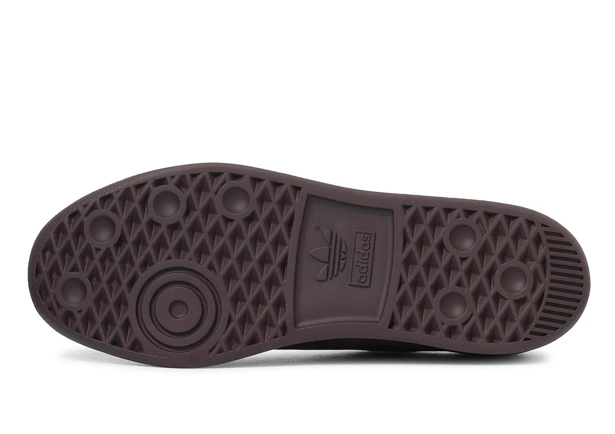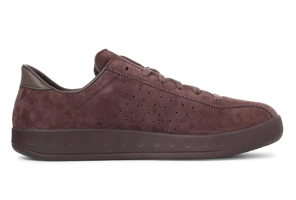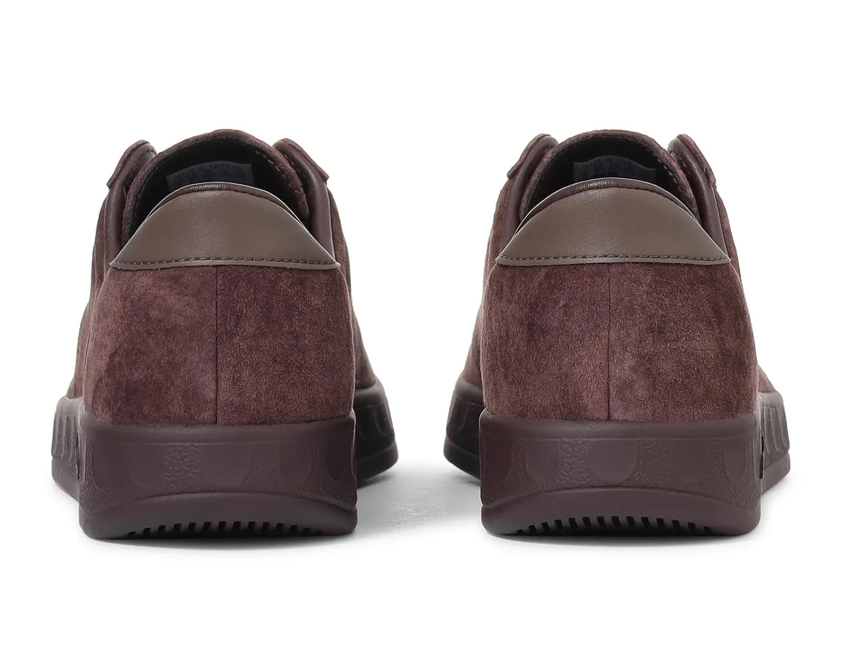 補強パーツは同系色で統一されていますがヒールタブには滑らかな質感のレザーが組み合わされ起毛面との対比がさりげないアクセントとして作用します。シューレースはアッパーに溶け込む落ち着いたブラウンで編まれた糸筋の陰影が履き口に向かって自然に収束し全体の調和を整えています。ライニングにはダークトーンが配され足を包み込む空間が引き締まり外観の深さを内側から支える印象が生まれます。アウトソールは軽快な質感を備えたポリウレタンで構成され厚みを抑えたプロポーションが横から見たときにすっきりとした輪郭を際立たせています。底面には三つ葉ロゴが穏やかに刻まれ丸みのあるトレッドパターンがさりげなくレジャーシューズのルーツを思わせます。