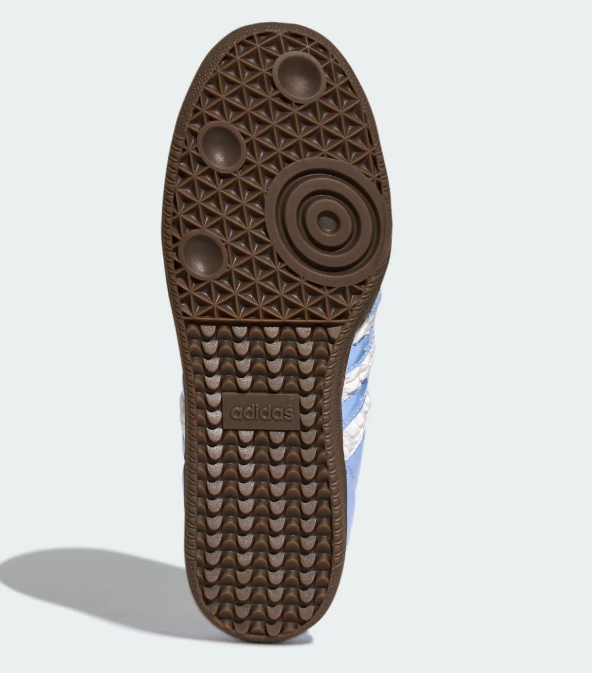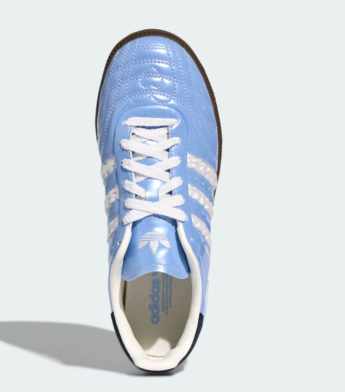 まず目を引くのはアッパー全体を包むブルーでそのみずみずしい色彩が光沢をともない浮き立つような存在感を放っています。アッパーの表面には緻密なステッチが全体を走り抜けサイドを彩るコアホワイトのスリーストライプスが絶妙なコントラストで映えています。