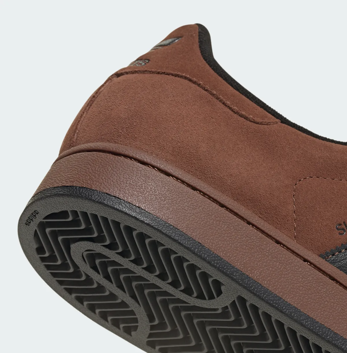 つま先部分にはスーパースターシリーズの象徴ともいえるシェルトゥがしっかりと配されておりクラシックムードを保ちつつも耐久性を強調しています。またミッドソールとアウトソールはプリラブドブラウンで統一されており足元全体のまとまりを作り出しています。アウトソールのパターンは滑り止め効果が高くストリートにおいても安心して履ける仕様です。