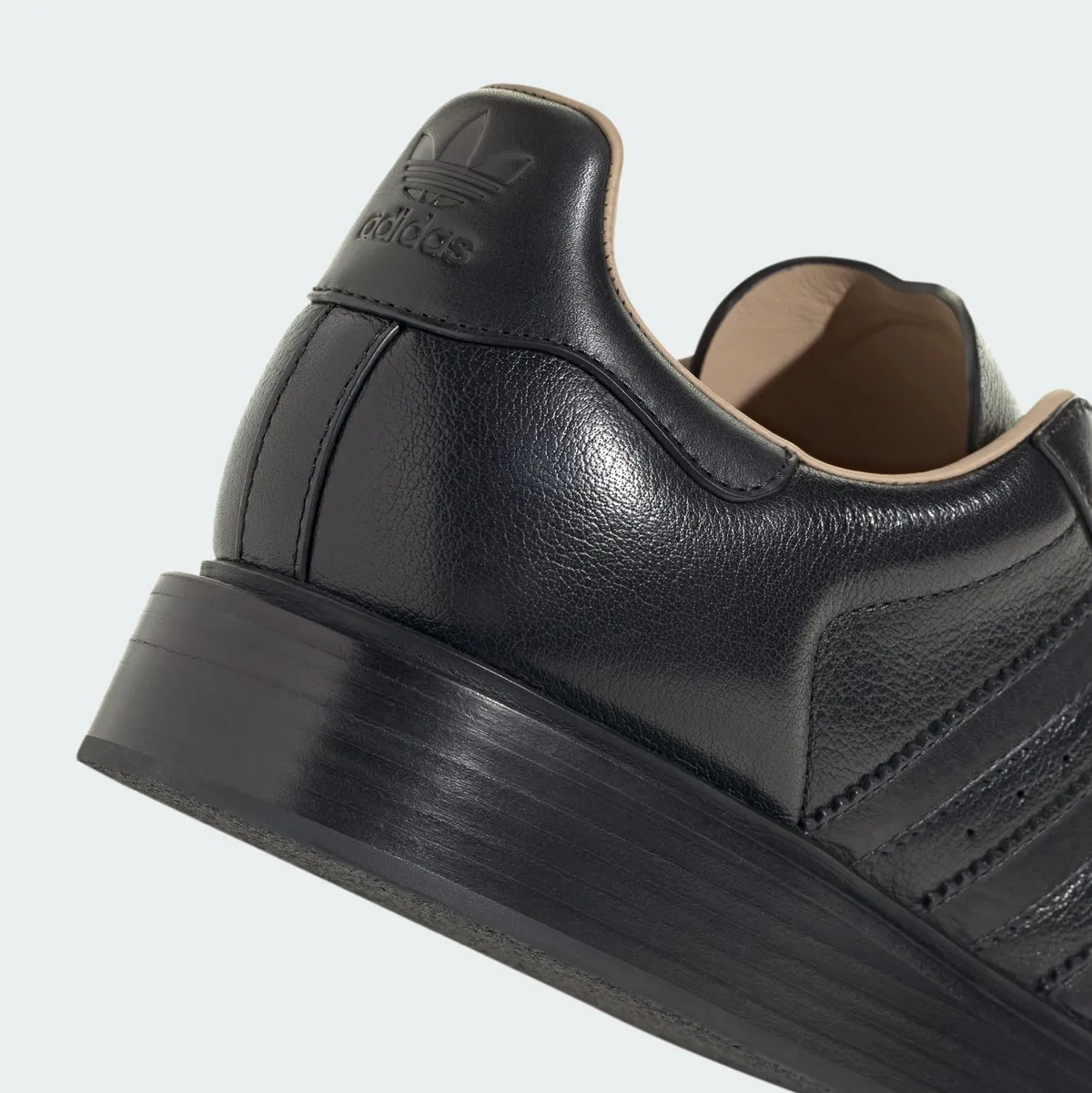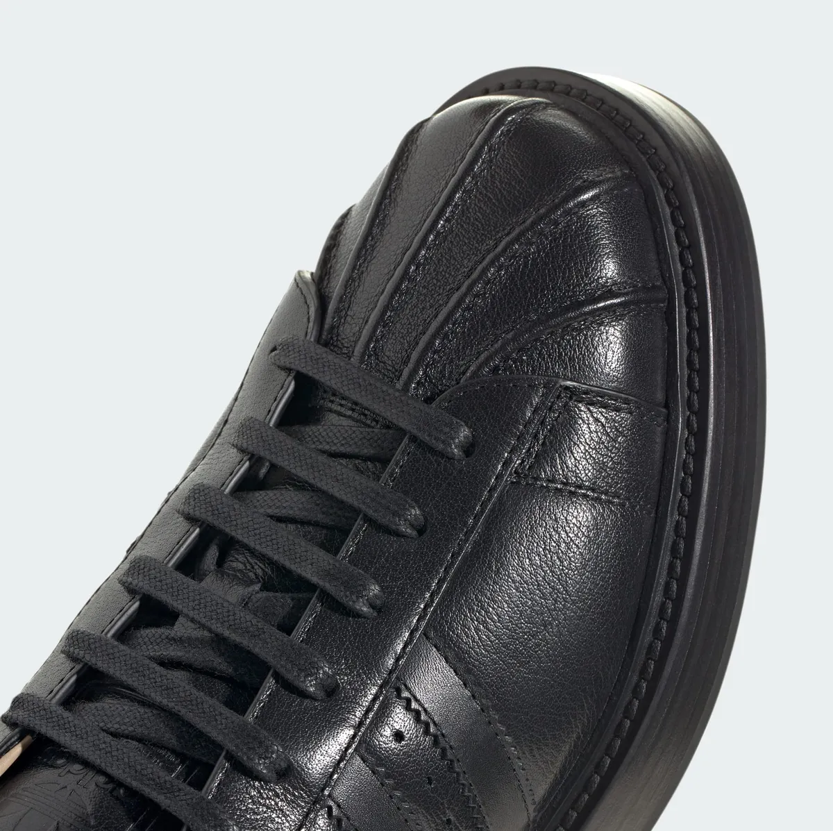 イタリア製らしい丁寧なつくりが際立ちアッパーにはしっとりとした質感を持つ本革が使用されています。マットな黒がベースカラーとなり微細な凹凸や豊かな革の表情が光の反射を受けて奥深いニュアンスを醸し出しています。サイドには定番のスリーストライプスがレザーで縫い付けられ外側と内側で絶妙な陰影が生まれています。シュータンやヒール部分もすべて同じブラックで統一され装飾を抑えたシンプルな構成が素材の上質さを強調しています。