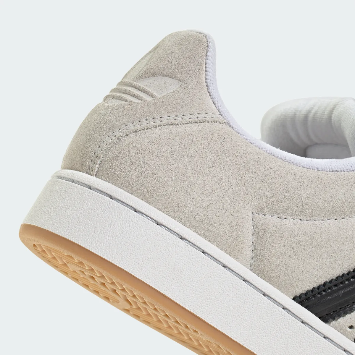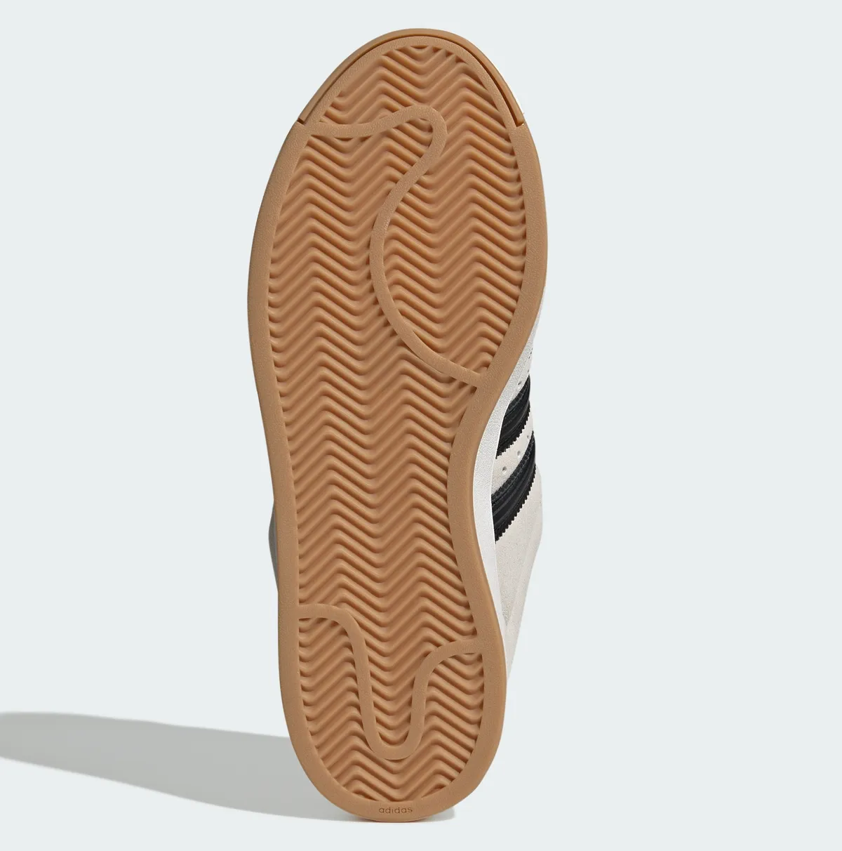 再構築されたシェルトゥは従来の滑らかなラインを保ちながらもやや厚みを増した立体的な造形で存在感を強めています。角度によって陰影が揺らぎつま先に力強い輪郭を描きます。サイドに走る成型スリーストライプスは精密に彫り込まれた溝が光を受けてわずかに濃淡を変えブラックの発色に深い奥行きをもたらしています。太幅のシューレースはアッパーとの対比で輪郭を際立たせバランスの良いボリュームをプラスしながらシューズ全体に洗練された重心を与えます。