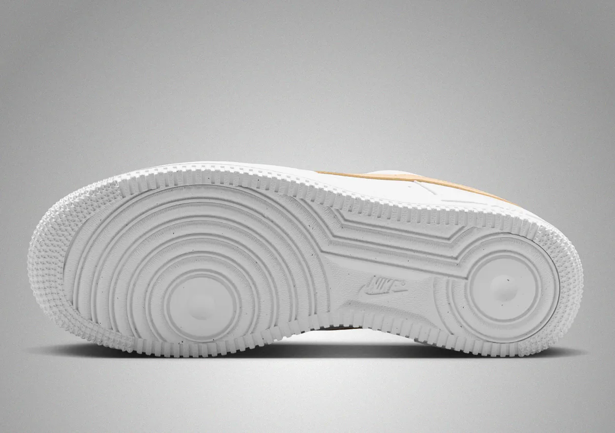 ミッドソールはエア フォース 1らしい厚みのあるフォルムでホワイトのソールユニットが清涼感を保ちつつ側面に浮かぶ「AIR」の刻印が控えめな存在感を放ちます。アウトソールには円状のパターンが刻まれ溝の深さによって陰影が変化し足裏の造形に奥行きを与えています。シュータンにはリネン色のロゴが配されアイレット周辺のホワイトレザーと対比することで視線を自然に上へと誘導します。インソールには再生素材を象徴するマークが添えられネクスト ネイチャーとしての理念をさりげなく示しています。全体としてホワイトを基調にした透明感の中にリネンの柔らかな色味が差し込むことで過度な主張を避けながらも洗練された佇まいを形成します。