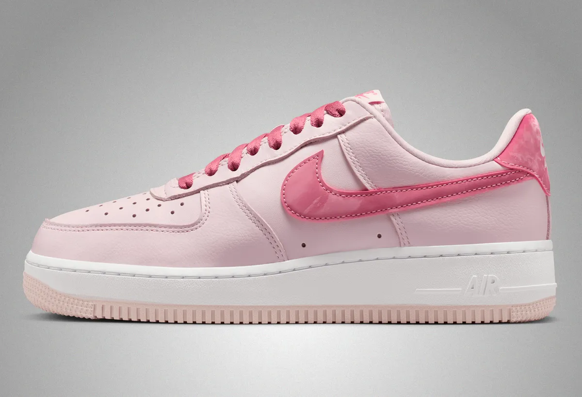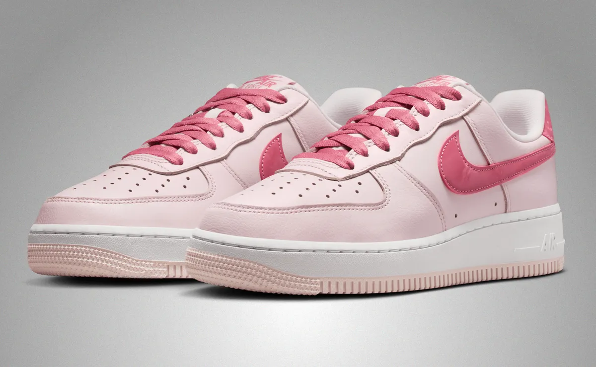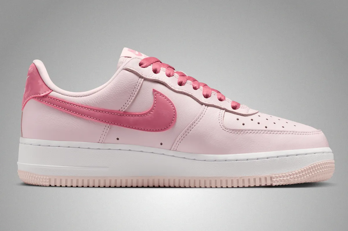 アッパーにはしっとりとした質感のレザーが採用され淡いパールピンクが面ごとにわずかな陰影を生み出します。サイドのスウッシュは濃淡のあるピンクで縁取りされアッパー全体の穏やかなトーンに鮮やかな旋律を加えます。ヒールタブの光沢を抑えたピンクや丁寧に走るステッチの線がレザーの柔らかさと構造の確かさを同時に感じさせます。シュータンのラベル、シューレースの編み目そしてハート型チャームの繊細な輝きまで細部に視線を誘う要素が巧みに散りばめられており履いた瞬間に足元がふわりと明るくなるような印象を与えます。