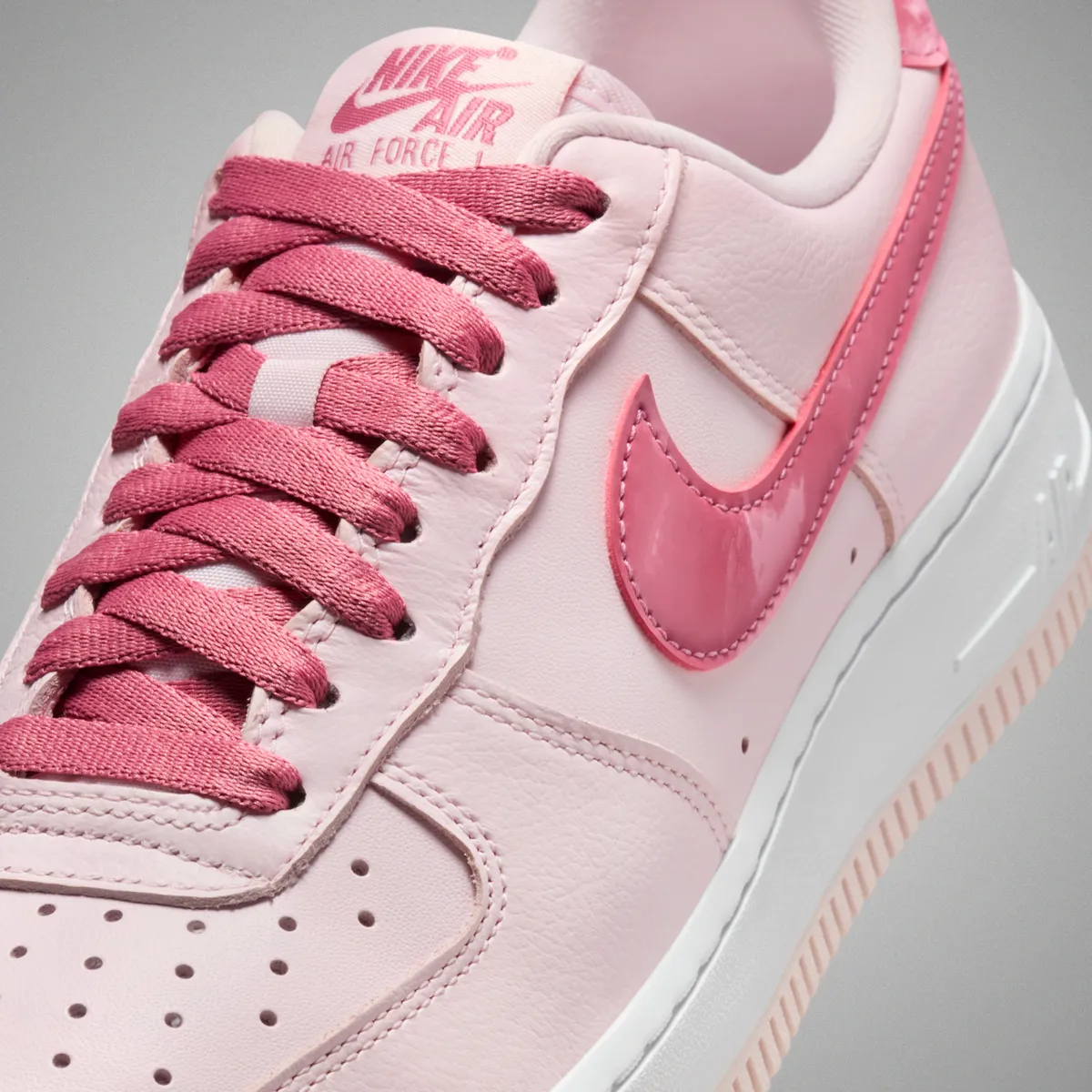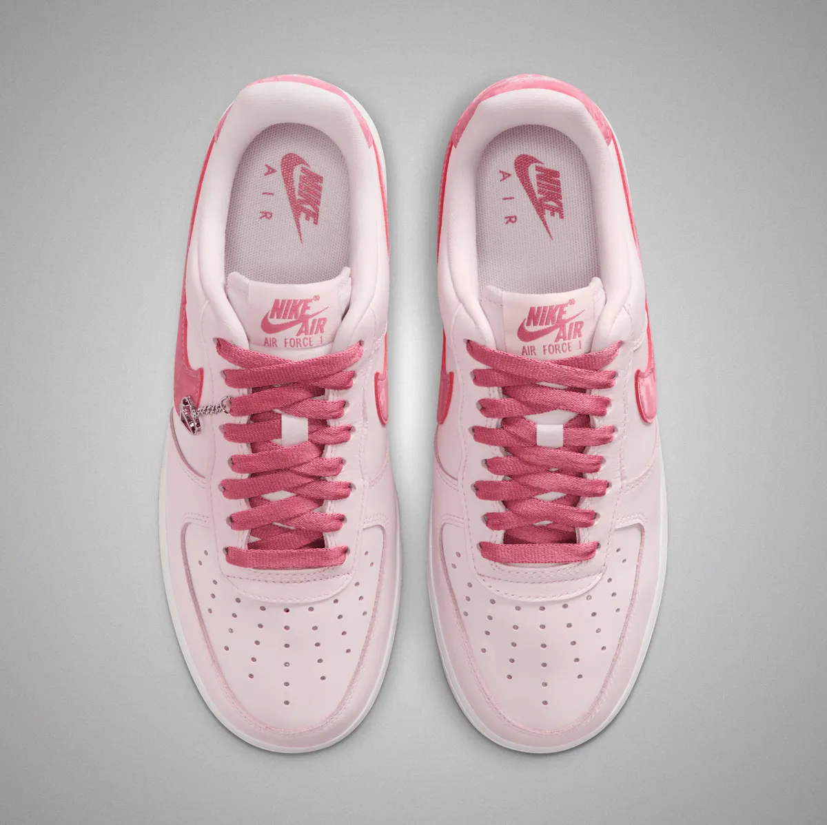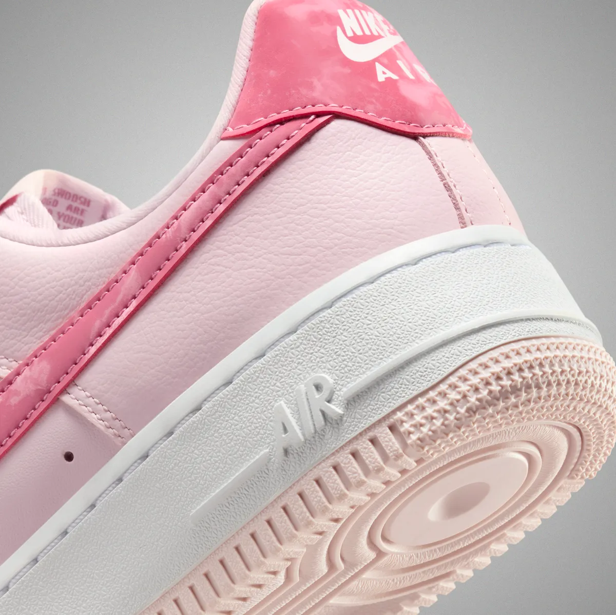 アッパーにはしっとりとした質感のレザーが採用され淡いパールピンクが面ごとにわずかな陰影を生み出します。サイドのスウッシュは濃淡のあるピンクで縁取りされアッパー全体の穏やかなトーンに鮮やかな旋律を加えます。ヒールタブの光沢を抑えたピンクや丁寧に走るステッチの線がレザーの柔らかさと構造の確かさを同時に感じさせます。シュータンのラベル、シューレースの編み目そしてハート型チャームの繊細な輝きまで細部に視線を誘う要素が巧みに散りばめられており履いた瞬間に足元がふわりと明るくなるような印象を与えます。