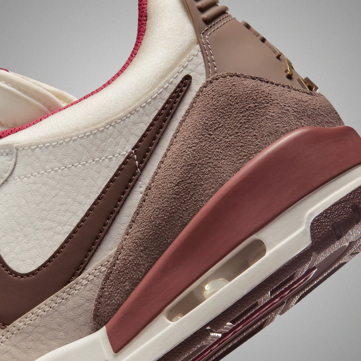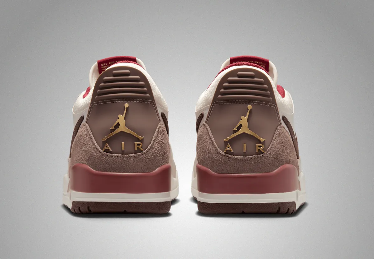シューレースには鮮やかな赤が採用されアッパーに馴染むトーンの中でもひときわ目を引きます。ベロ部分には「ジョーダンブランド」のロゴが金色で輝き特別感を添えています。サイドのスウッシュロゴはブラウンで描かれレザーの滑らかさと共に存在感を放っています。ヒールカウンターにはゴールドのジャンプマンが象徴的に配されておりサイドのスエード部分とも調和して全体に上質さを与えています。