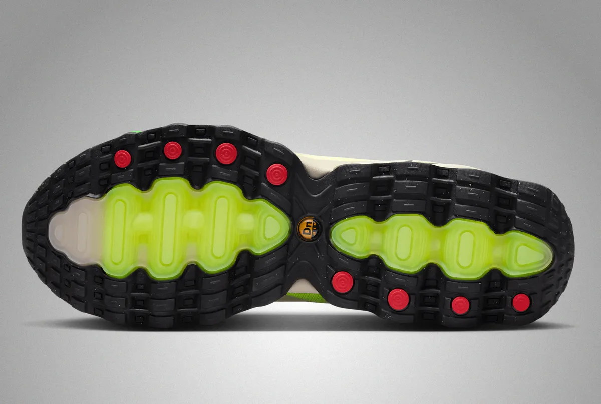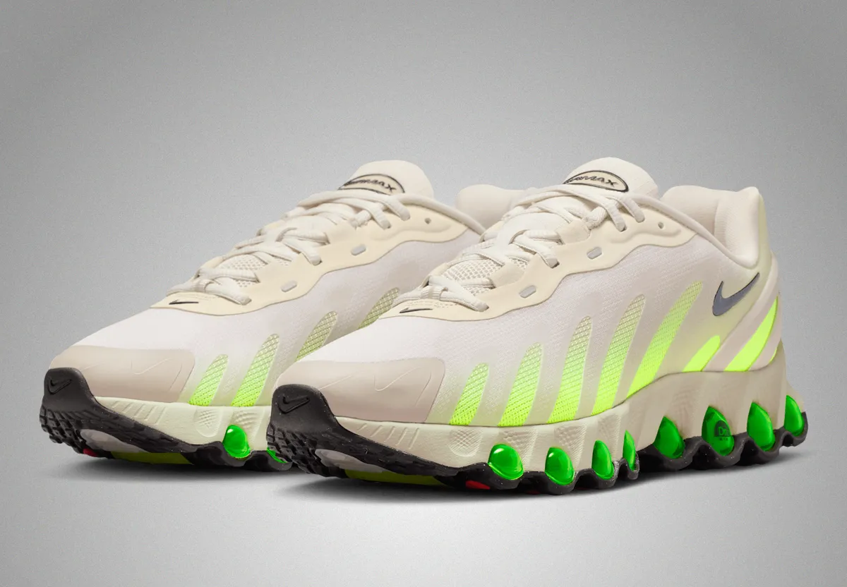 まず目を引くのはアッパーの質感とカラーの組み合わせです。「ライトオールドウッドブラウン」と「ムーンパーティクル」の穏やかなベージュトーンが全体を包み込み柔らかく落ち着いた雰囲気を演出します。この色合いは肌馴染みが良いだけでなくさまざまなストリートウェアに自然とマッチします。その中でアクセントとして配置された「ボルトアイス」の鮮やかな蛍光グリーンが目を奪います。外側から見えるエアユニットにこのカラーが鮮やかに映え動きのあるデザインが際立っています。