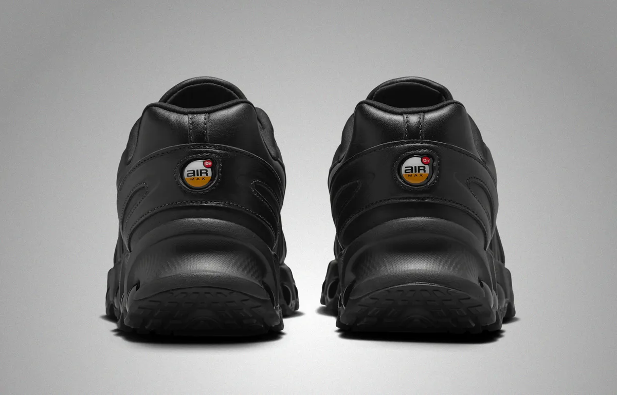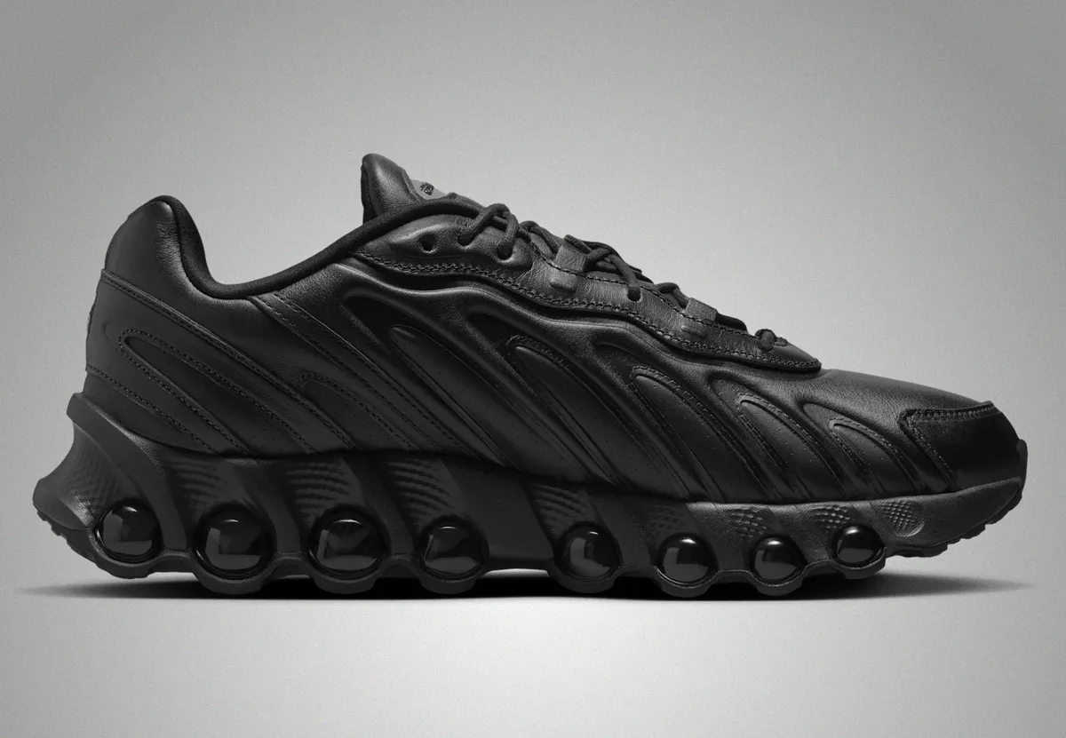 ナイキ エア マックス Dn8 ブラック レザーは、視界を埋め尽くす深い漆黒で統一された一足で、素材の持つ質感の差異によって豊かな表情を生み出しています。