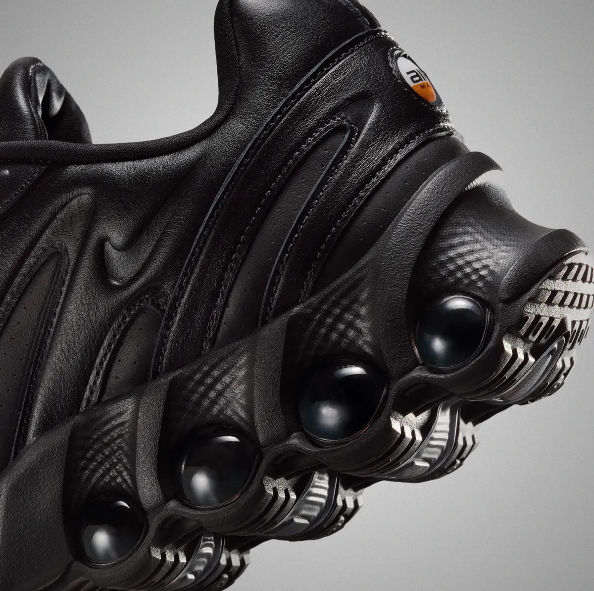特筆すべきはソールユニットに搭載された独創的なエアクッショニングシステムです。ヒール部分には円形の独立したエアチャンバーが整然と並びその透明感のある樹脂素材がアッパーの不透明なレザーと鮮やかな対比を描いています。これら8つのポッドはまるで精密機械のパーツのような機能美を放ち地面を捉えるアウトソールの無骨なトレッドパターンと共にこのシューズが持つアグレッシブな性格を象徴しています。ミッドソール部分はマットな質感で仕上げられておりアッパーの輝きを抑制することで全体のバランスを整える役割を果たしています。