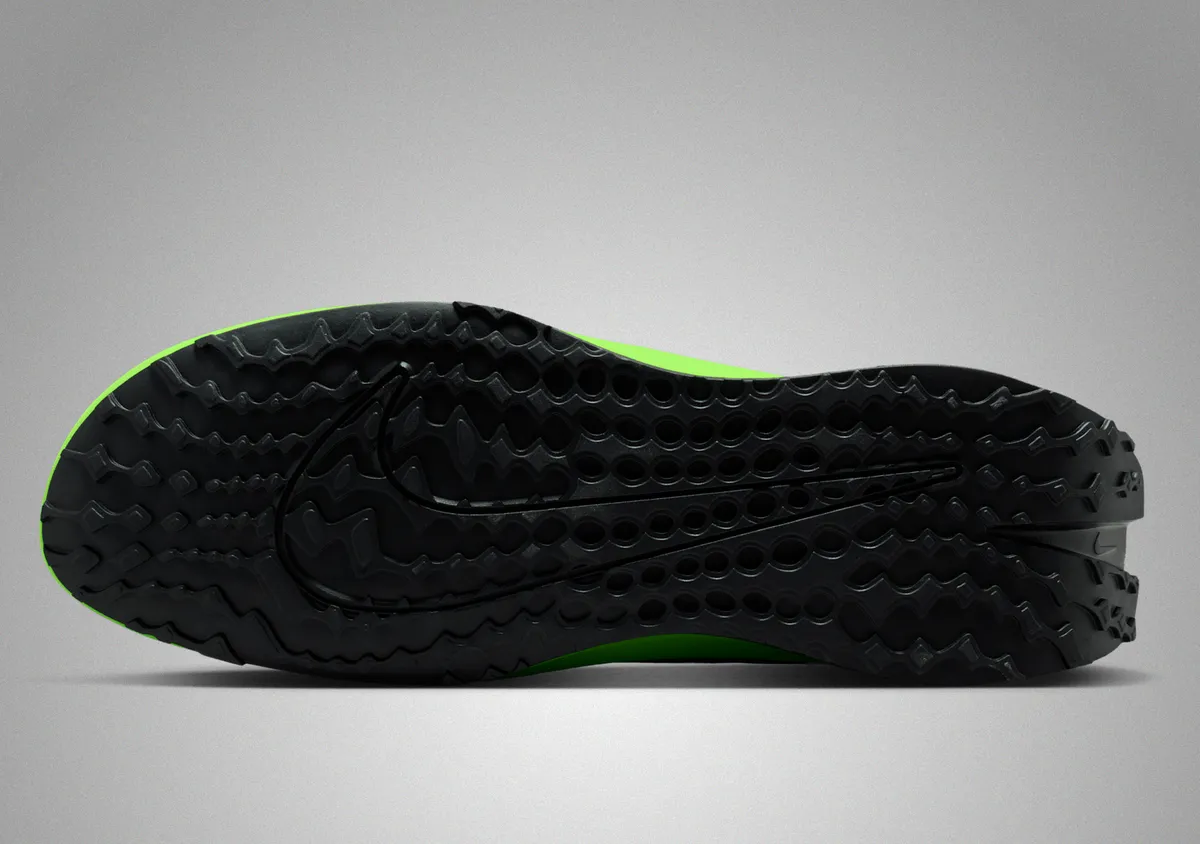 アッパー全体を包むグリーンは均一な発色ではなく角度によってわずかに濃淡が揺らぐように見え流れるようなフォームラインと相まって動き出す前から疾走の気配を宿します。表面は滑らかな質感を基調としながらもシューレース周辺に配されたブラックの補強パーツが精密なコントラストを生み鮮やかな色調を引き締めています。サイドに描かれたスウッシュは細く鋭い軌跡を描きボディの躍動感をさらに強調します。