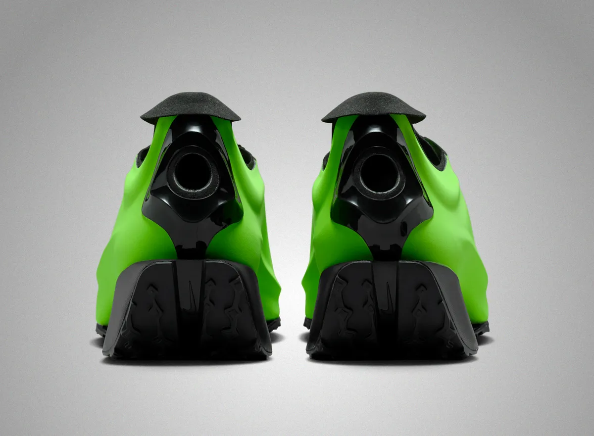 シュータンと履き口まわりには微細なテクスチャーが施され、ブラックのシューレースはマットな編み込みが際立ち鮮やかなアッパーと交差することで視線を中心へ引き戻します。サイドから見えるソールユニットは前後で厚みの高低差があり滑らかに沈み込むようなカーブが形作る影が立体的で豊かな表情を加えています。エレクトリックグリーンとブラックの二極構造でありながら単純な配色ではなく境目のラインが柔らかく溶け込む部分もあり静かに躍動するような視覚的リズムが生まれています。