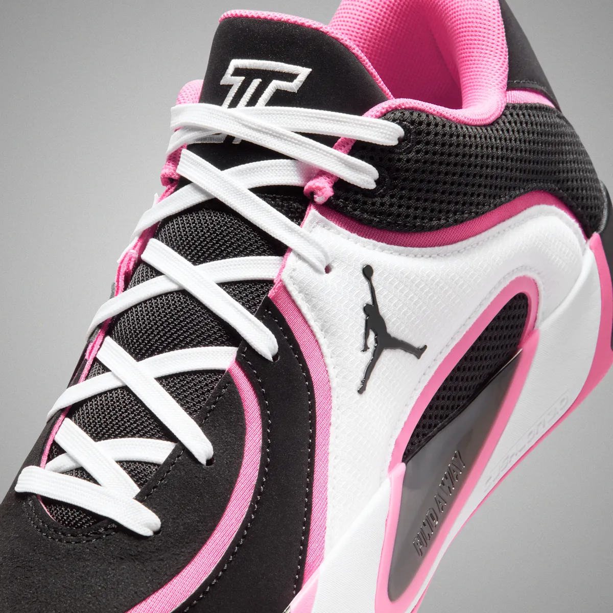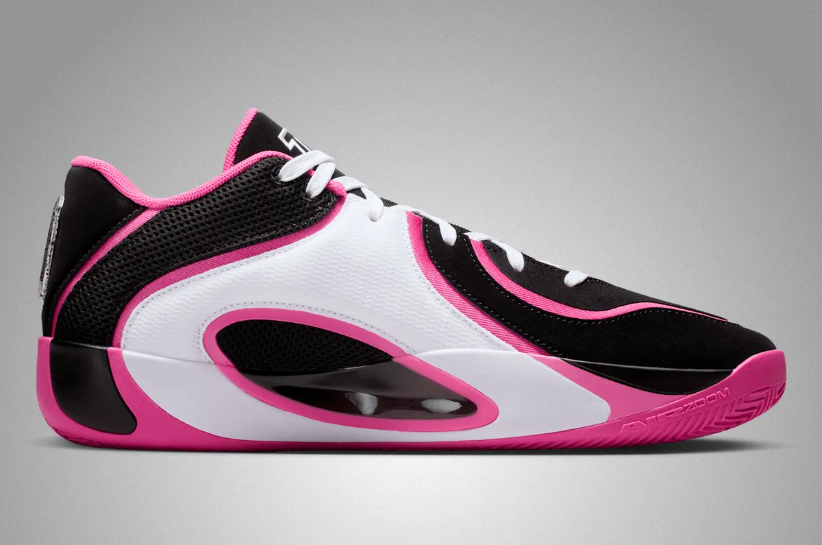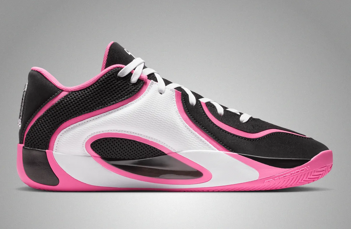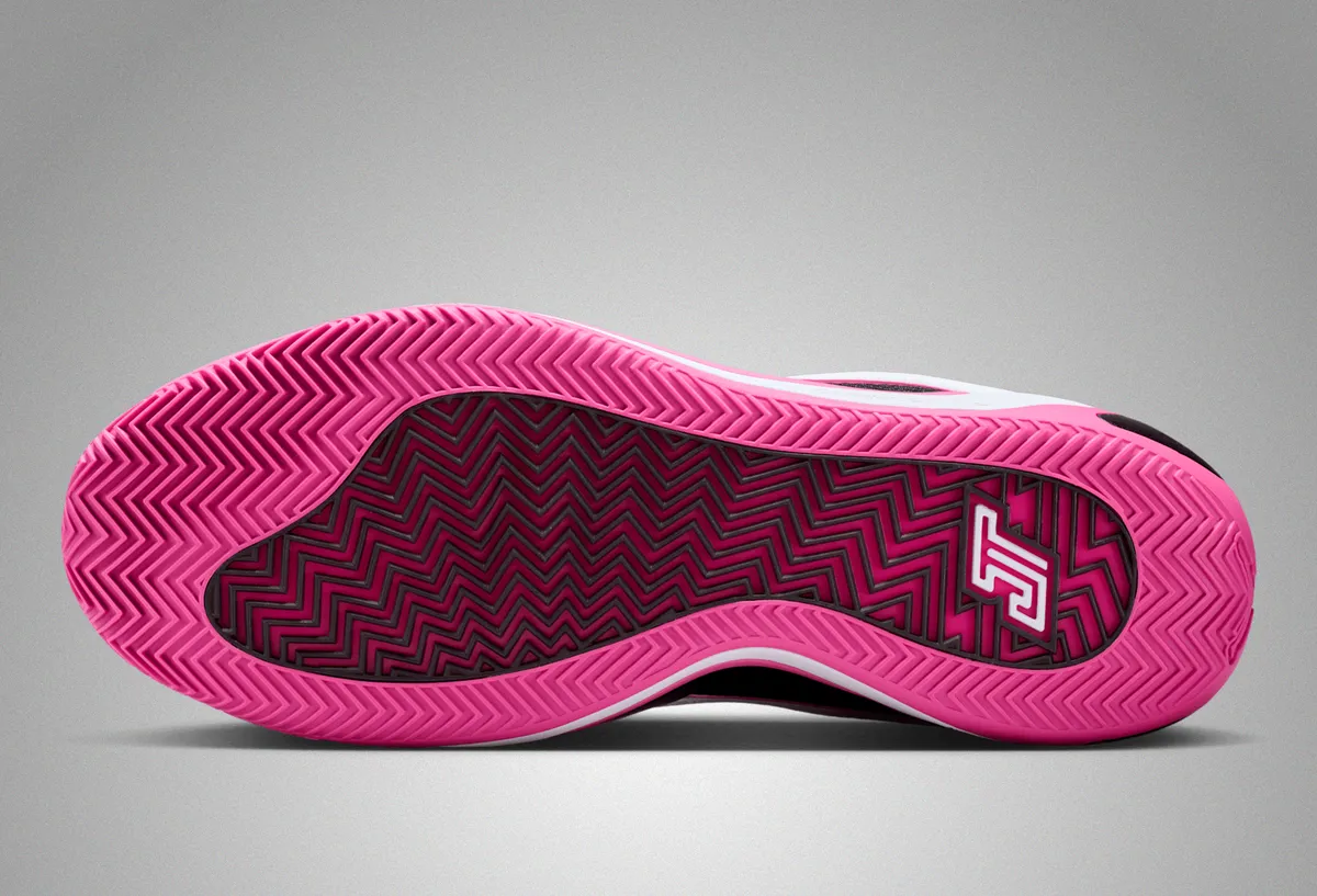 つま先にかけてはブラックの表面にホワイトのステッチが軽やかに走り編み上げ部分のレースホールはホワイトとピンクが交互に連なり視覚にリズムを与えています。タンにはテイタムの象徴的なロゴが白く浮かび上がりシューレースの動きを受けながら力強いアクセントとして存在しています。ヒール周りはブラックメッシュの奥に柔らかなピンクが覗き縁取りの曲線が足首のラインを柔らかく包み込むように仕上げられています。