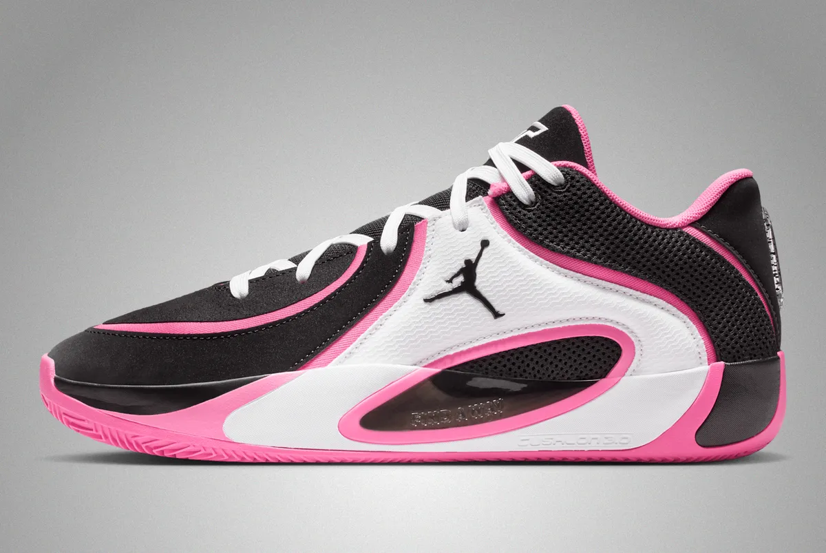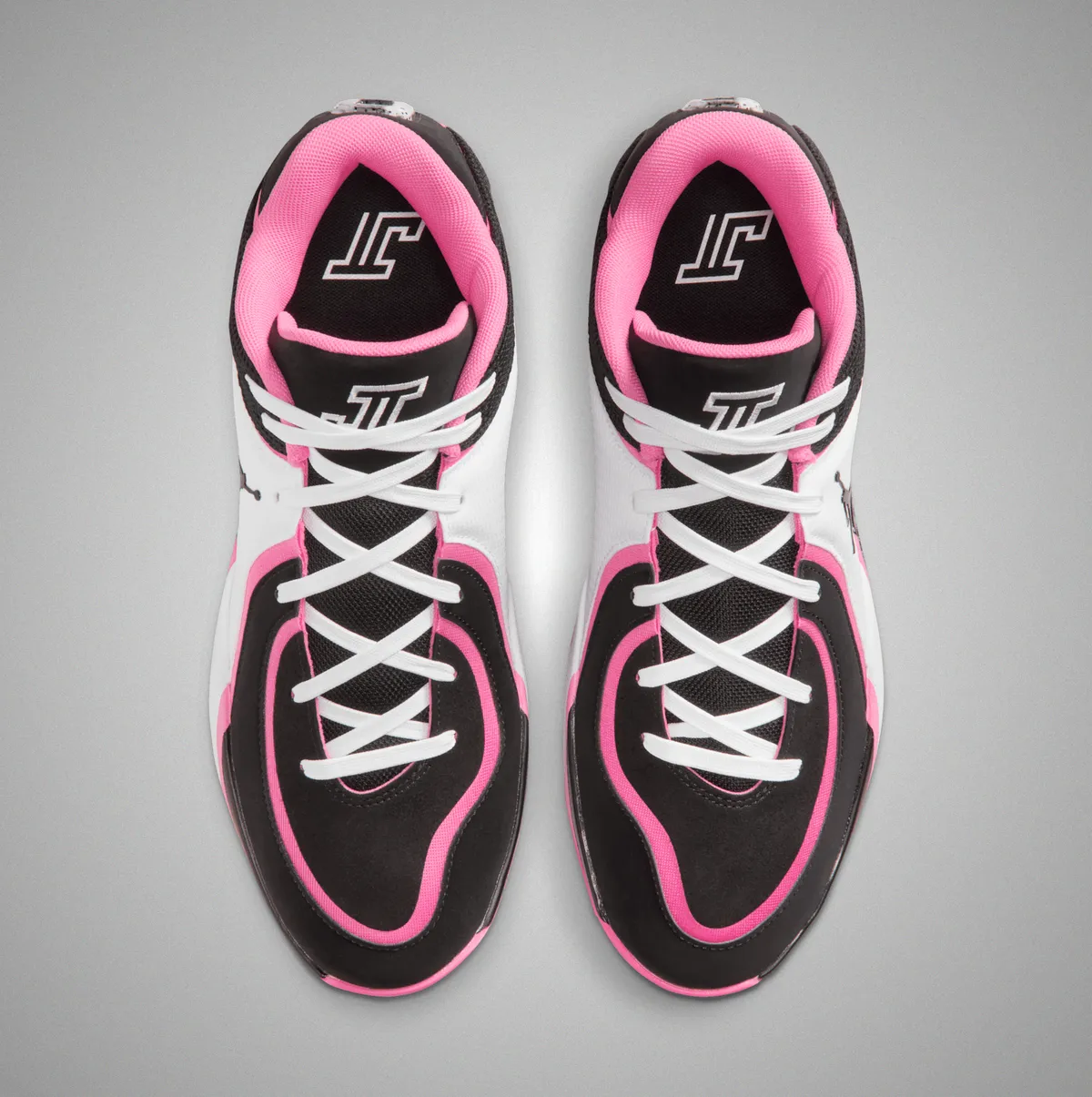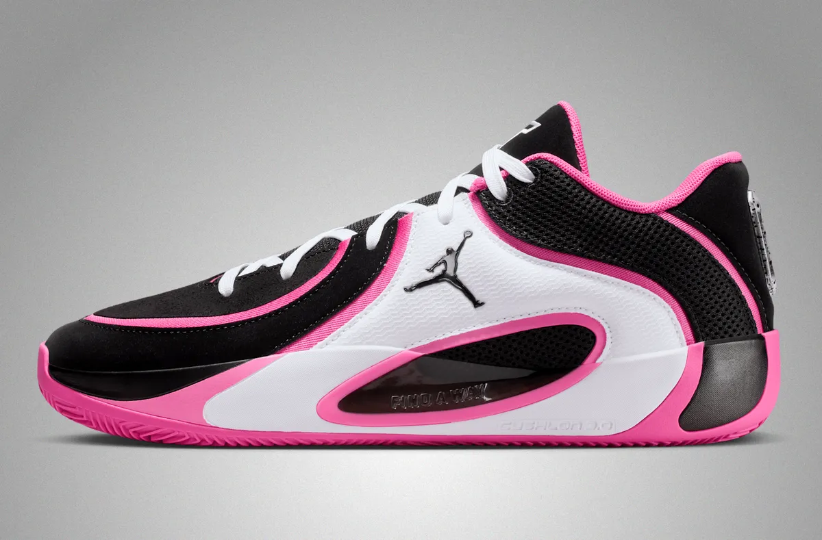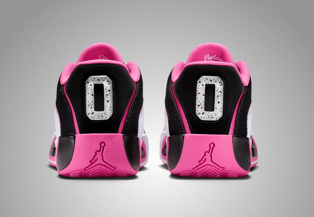 つま先にかけてはブラックの表面にホワイトのステッチが軽やかに走り編み上げ部分のレースホールはホワイトとピンクが交互に連なり視覚にリズムを与えています。タンにはテイタムの象徴的なロゴが白く浮かび上がりシューレースの動きを受けながら力強いアクセントとして存在しています。ヒール周りはブラックメッシュの奥に柔らかなピンクが覗き縁取りの曲線が足首のラインを柔らかく包み込むように仕上げられています。
