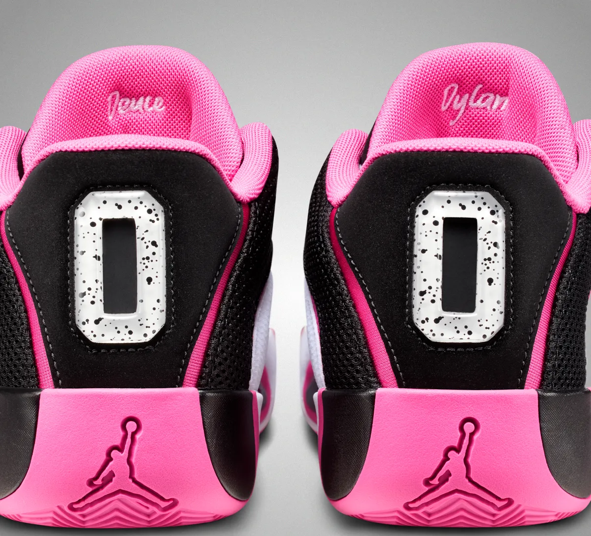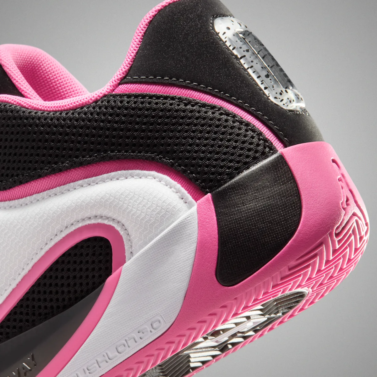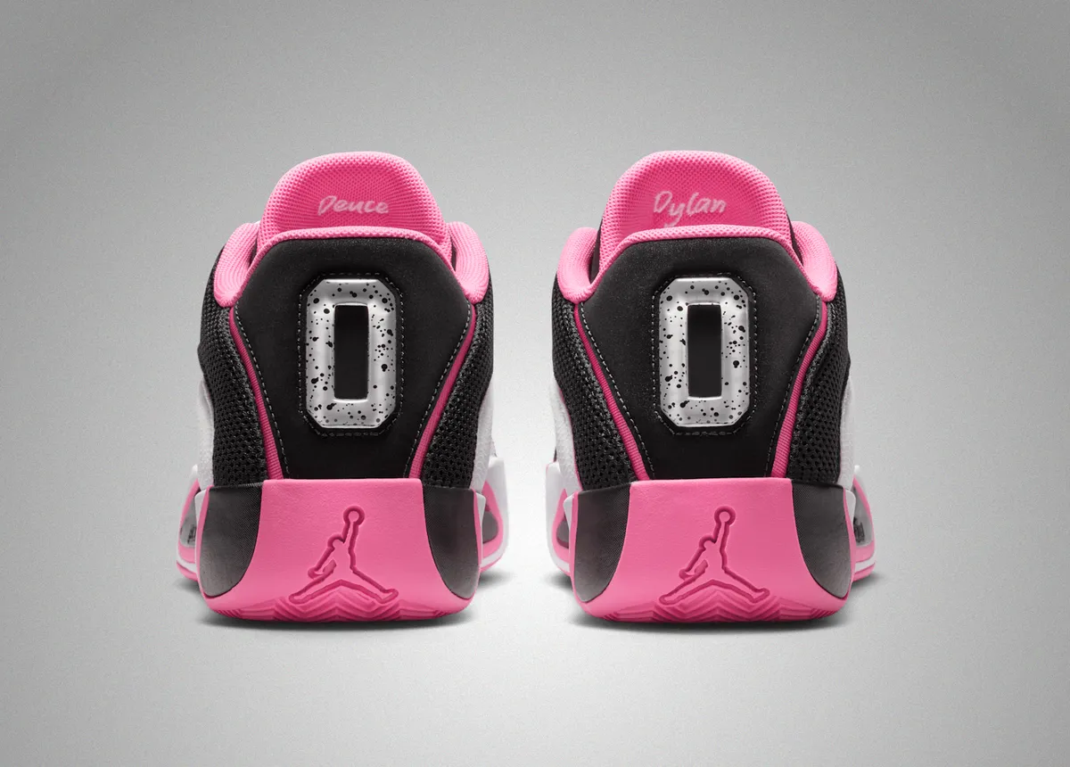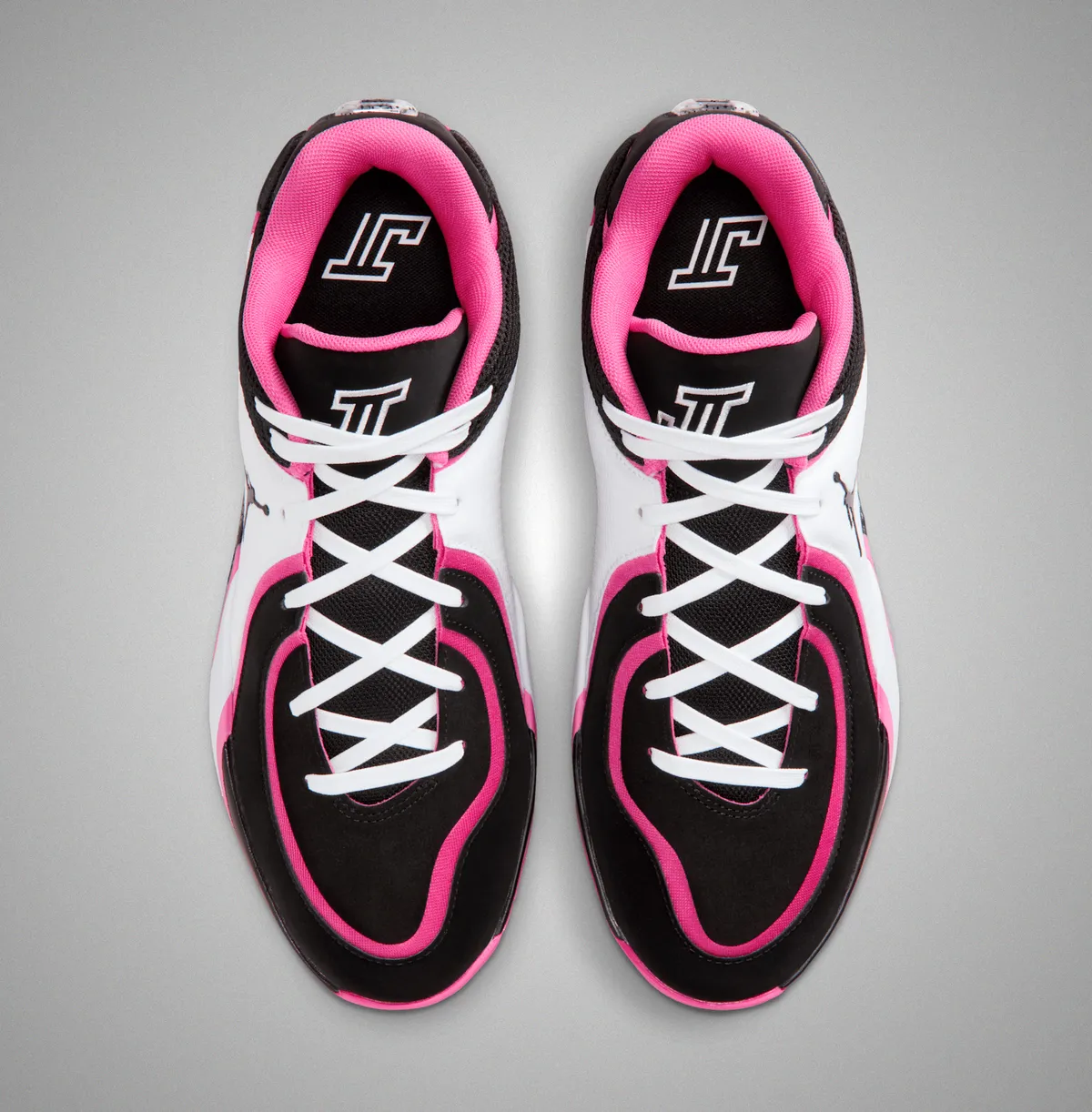 つま先にかけてはブラックの表面にホワイトのステッチが軽やかに走り編み上げ部分のレースホールはホワイトとピンクが交互に連なり視覚にリズムを与えています。タンにはテイタムの象徴的なロゴが白く浮かび上がりシューレースの動きを受けながら力強いアクセントとして存在しています。ヒール周りはブラックメッシュの奥に柔らかなピンクが覗き縁取りの曲線が足首のラインを柔らかく包み込むように仕上げられています。