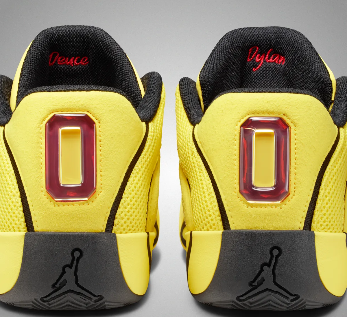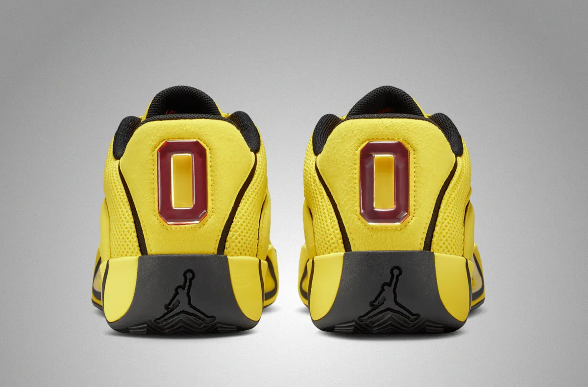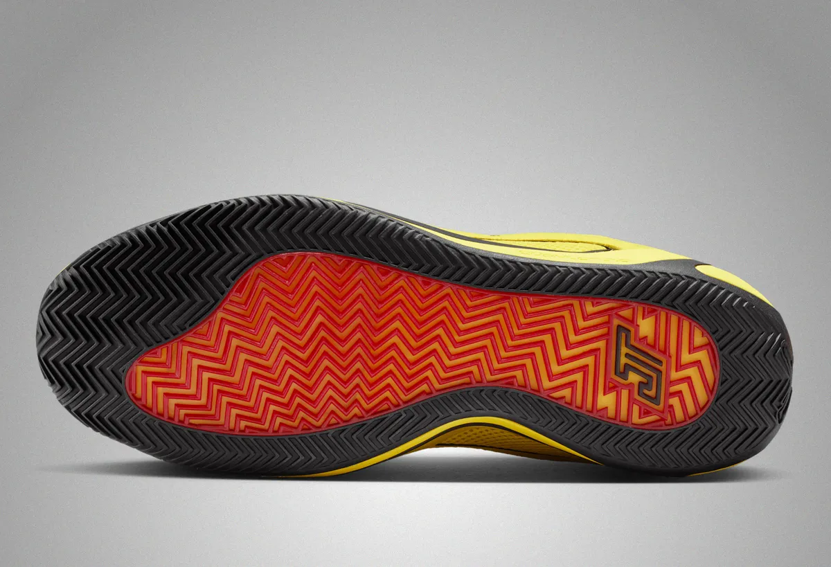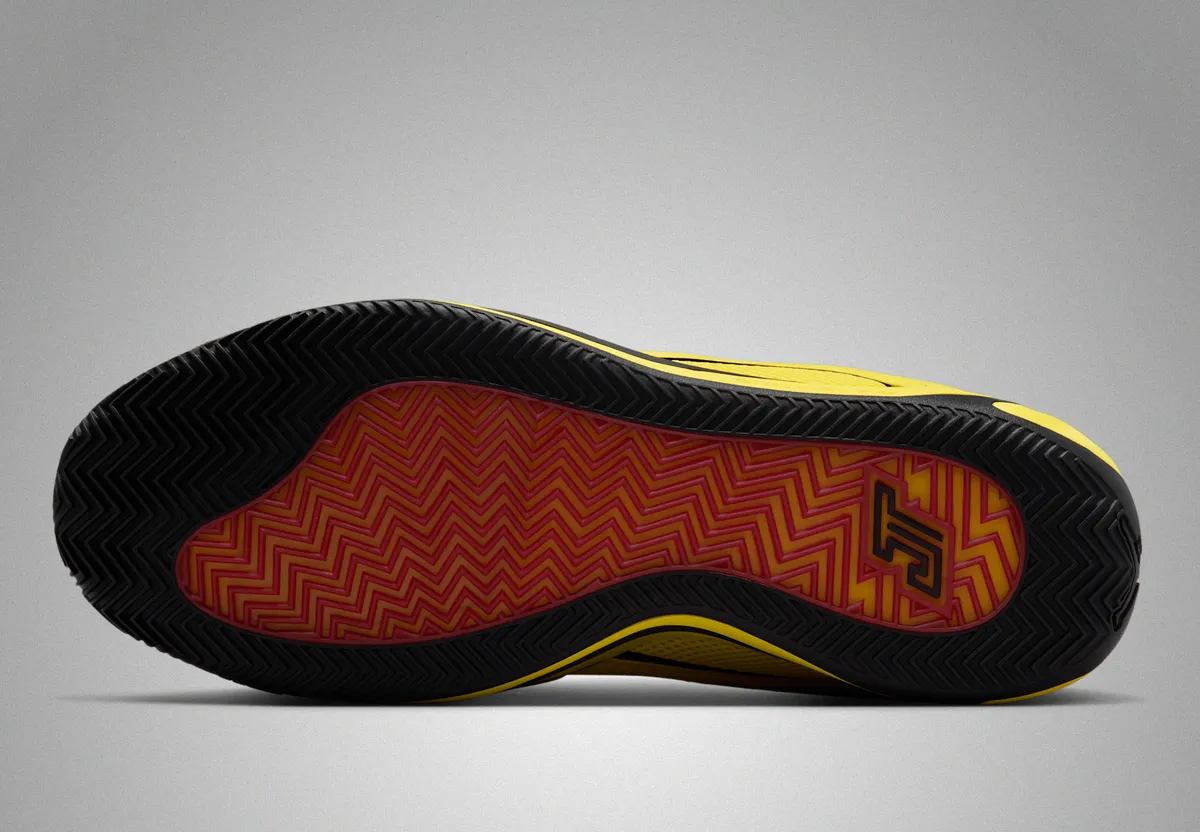 アウトソールはブラックとレッドが層を成し中央部の模様は波紋のような構造体で踏み込んだ際のエネルギーが外へ広がるイメージを喚起します。横から眺めるとソール全体の起伏が滑らかに続き軽快なプロポーションがテイタムらしい俊敏な動きを連想させます。付属のシューレースはイエローとレッドの2本が用意され足元の印象を自在に変えられる遊び心も備えています。シューズボックスは落ち着いたブラックに円形パターンが散りばめられ外観の鮮烈さとは対照的な静かな佇まいでモデルの存在感を引き締めています。