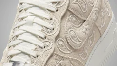 アッパーの素材は細かな凹凸を備えた軽量メッシュを基調とし面ごとにわずかに異なる粒度が生まれることで柔らかな陰影が靴全体に広がります。曲線を描くブラックのラインは単なる装飾に留まらずシルエットの躍動感を際立たせる“流れ”のように配置され軽快なボディラインを紡ぎます。