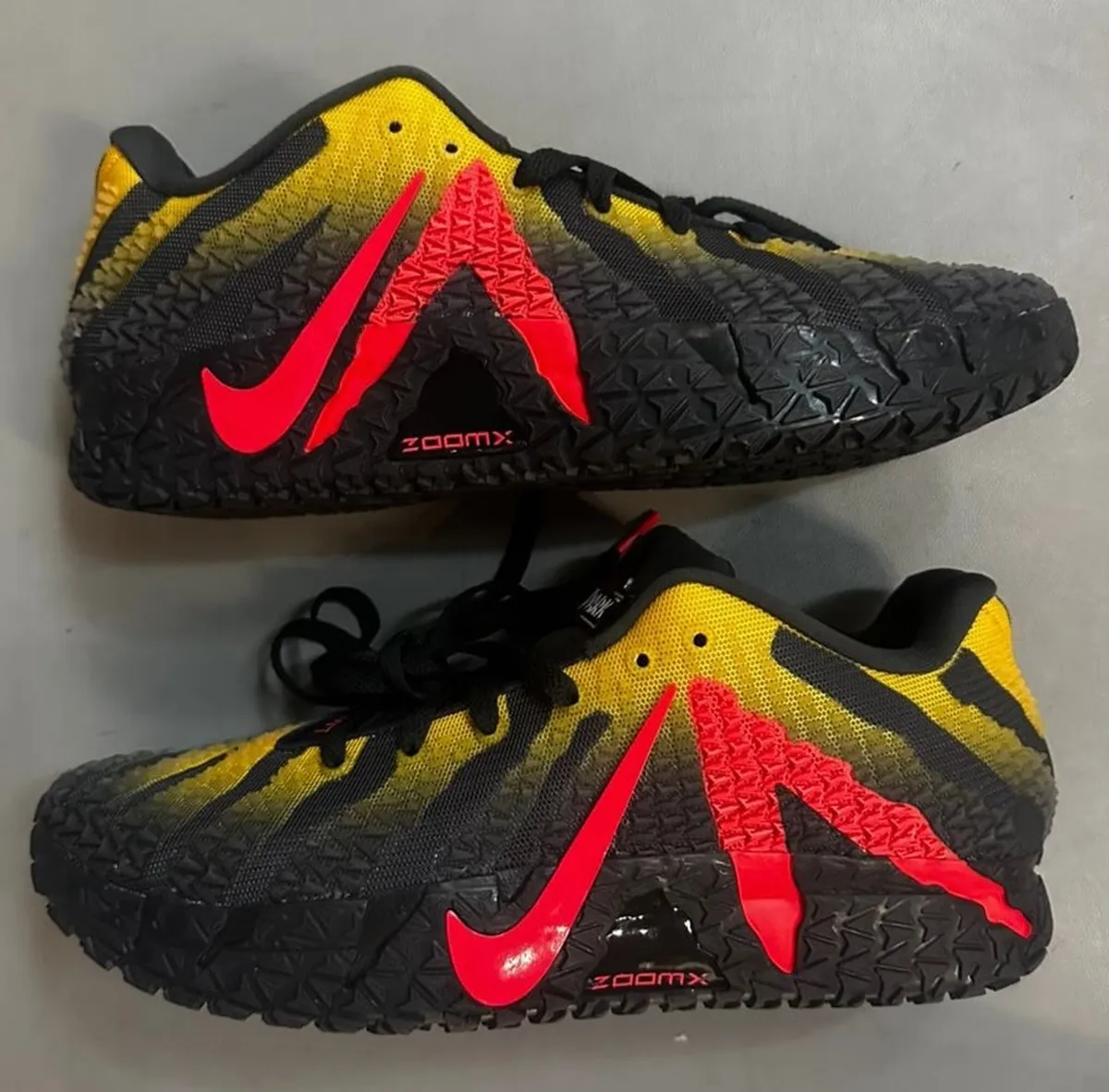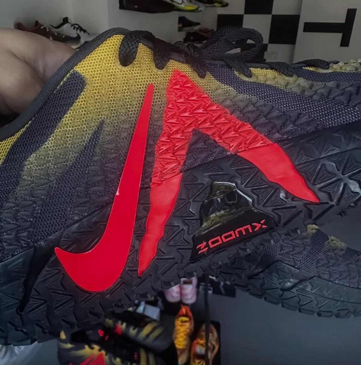3つの配色がフランチャイズを象徴するロゴの色調を連想させアッパー全体に広がる黒から黄へのグラデーションは荒々しい大地と擦れた警戒色を思わせる緊張感を帯びています。編み目の細かなメッシュは獣皮のような起伏を宿しそこに重なるジグザグ状のラインが躍動感を生みシューズの輪郭に野性的な息遣いを与えています。サイドを走るジャの文字は濃いルビー色で刻まれ鋭い爪痕のように視線をさらいます。アウトソールは立体的なパターンが複雑に組み合わされ地を踏みしめるたびに爬虫類の足跡を思わせる重厚な印象をもたらします。