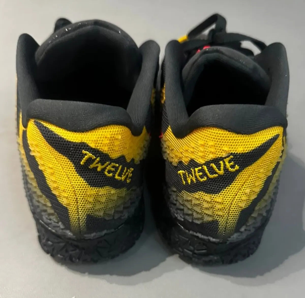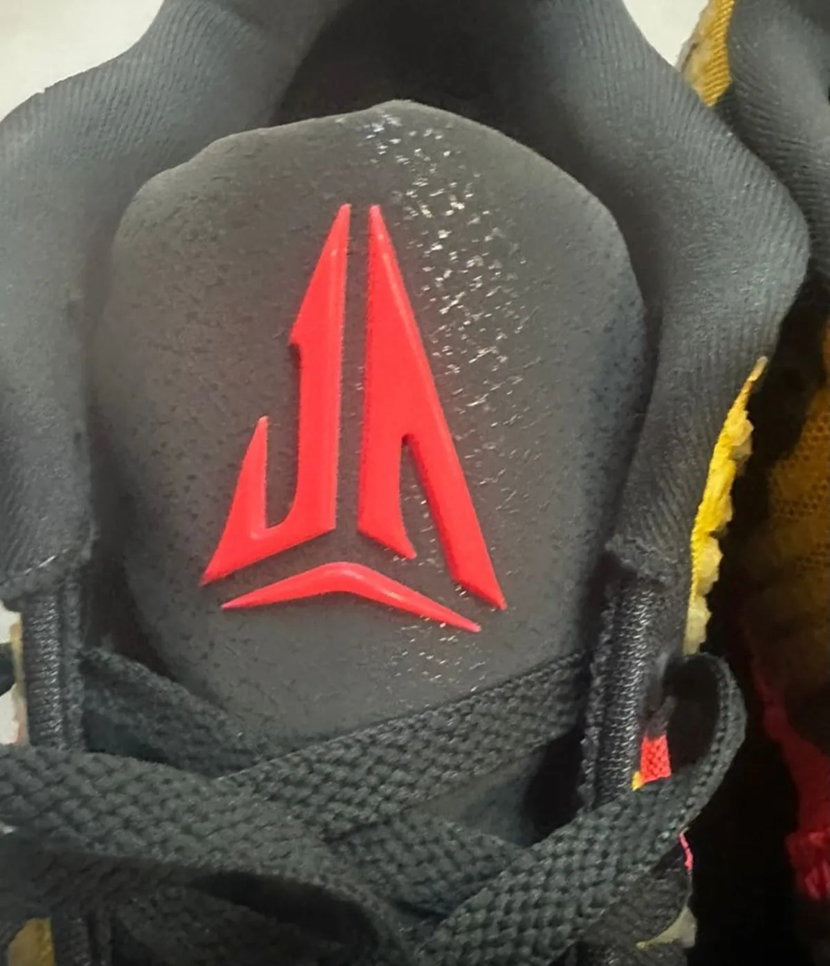 シュータンには左右で異なる意匠が施され右足にはジャ モラントを象徴するエンブレム左足には映画の象徴であるジュラシックパークのロゴが配置されています。鮮烈な赤と黒の円形ロゴはシューズのテーマを決定的に示す証として機能します。さらにインソールを合わせるとヴェロキラプトルが背を丸めて迫る一場面が現れ足を入れるたびに映画の緊張感が蘇ります。ヒールには“Twelve”の文字がしっかりと刻まれ選手の物語性をさりげなく織り込んでいます。細部のステッチや補強パーツも色調に合わせて丁寧に構成され全体の統一感を損なわず視覚的な密度を高めています。
