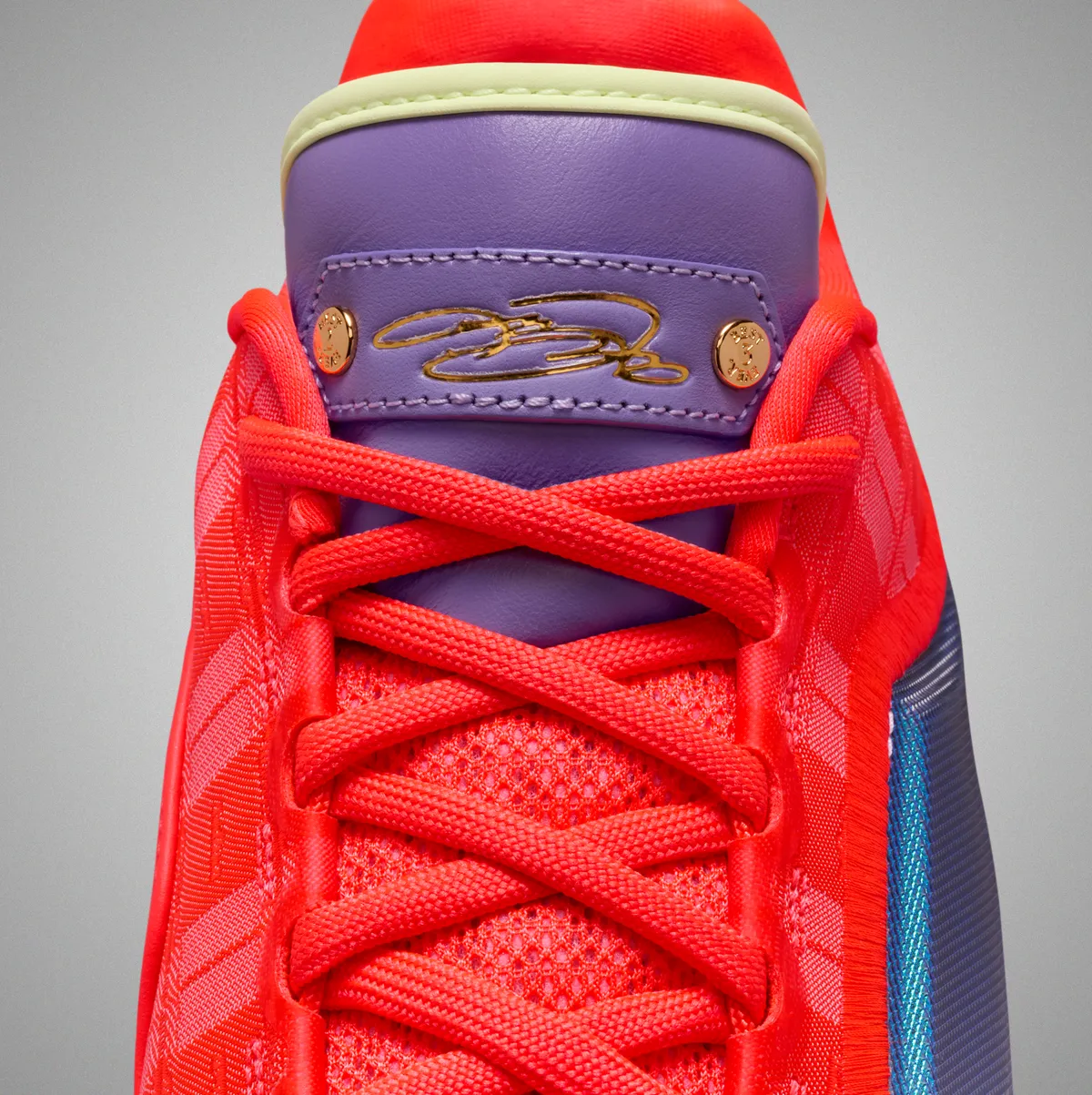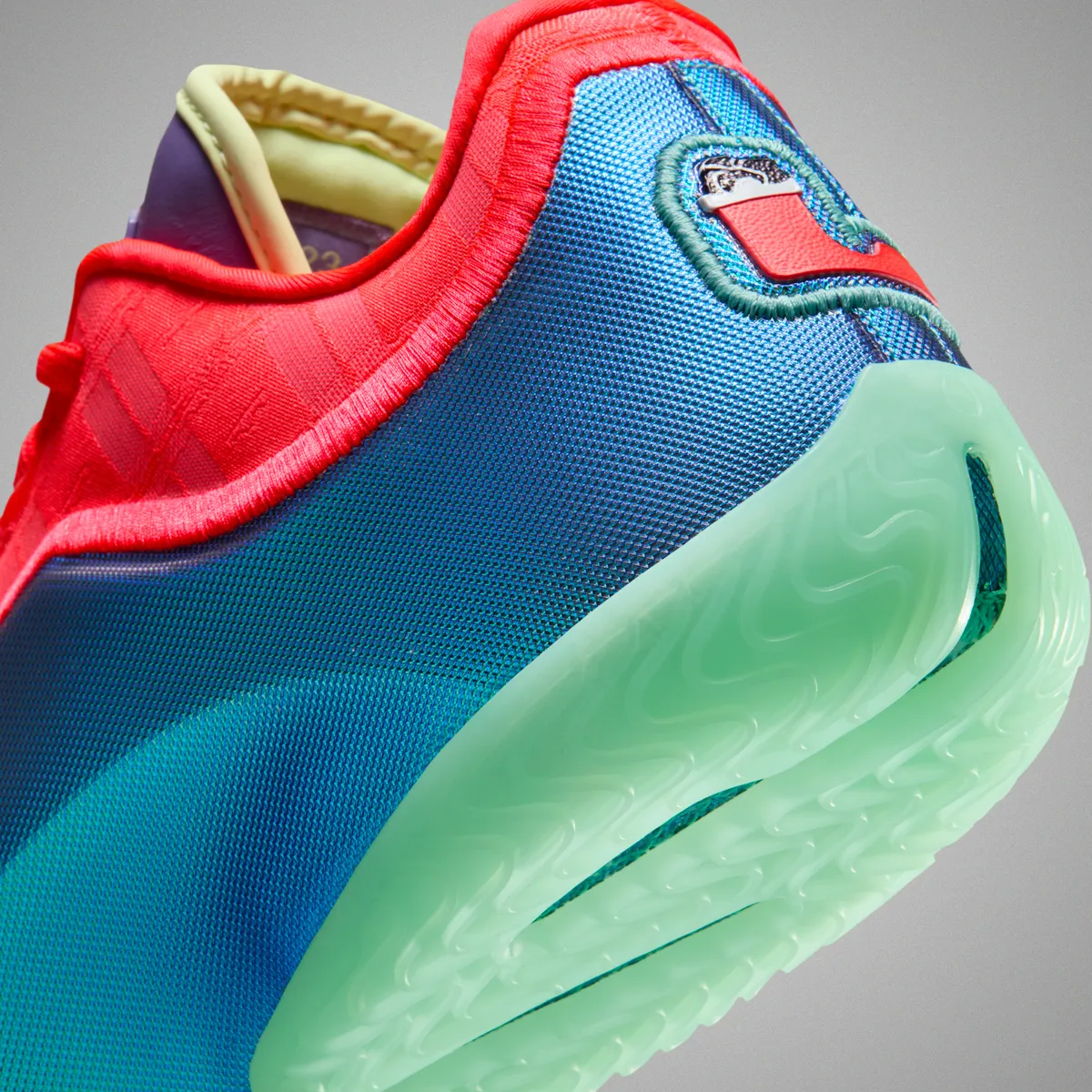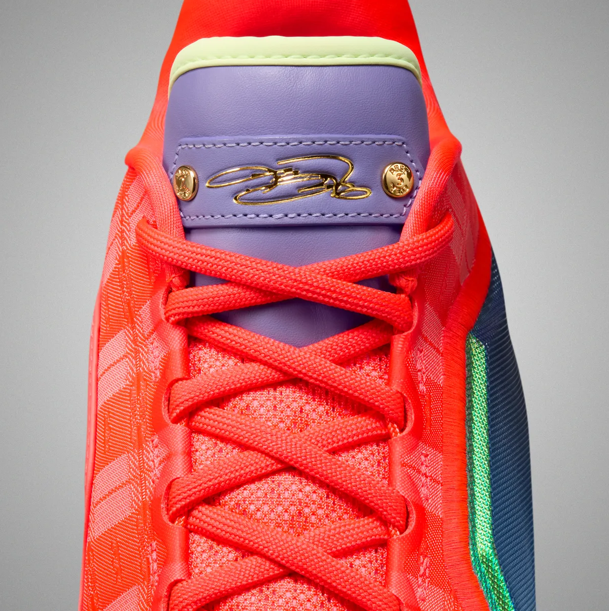 鮮やかなブライトクリムゾンを軸にダスティーアメジストの落ち着いた紫ベアリーボルトの軽やかなグリーンさらに深みのあるブルーが重なり祝祭の空気を多層的に描き出します。アッパーにはエンジニアードジャカードを採用し織りの陰影が微妙な濃淡を生み見る角度ごとに表情を変えます。