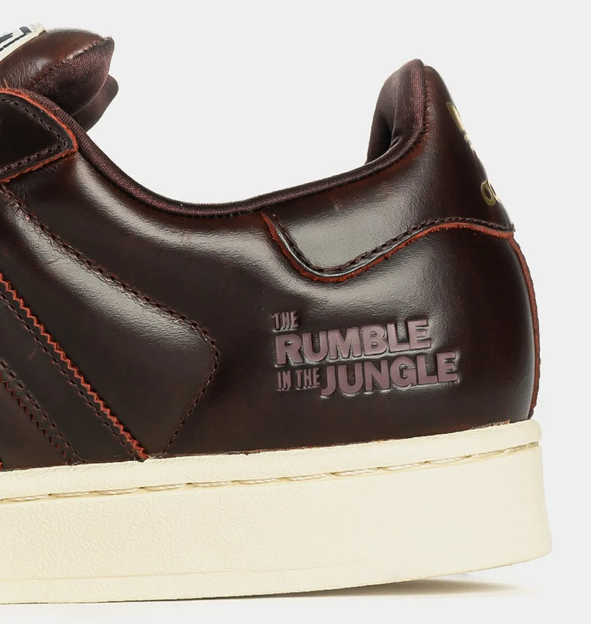 ミッドソールは優しい生成り色でまとめられアッパーとの調和を保ちながらも輪郭に奥行きを与えています。アウトソールはクラシックなパターンが刻まれ足裏に伸びる無数の溝が視覚的にも動きを感じさせるような表情を作り出します。ヒールの周囲には独特の曲線が走りそこにアリの名試合がエンボス加工で刻まれています。「THE RUMBLE IN THE JUNGLE / キンシャサの奇跡 – 1974年のジョージ・フォアマンとの試合」と「THRILLA IN MANILA / マニラの激闘 – 1975年のジョー・フレイジャーとの試合」という2つの試合名は表面に浮かび上がるような立体的テクスチャーで再現され背景に込められた激闘の記憶を思い起こさせます。