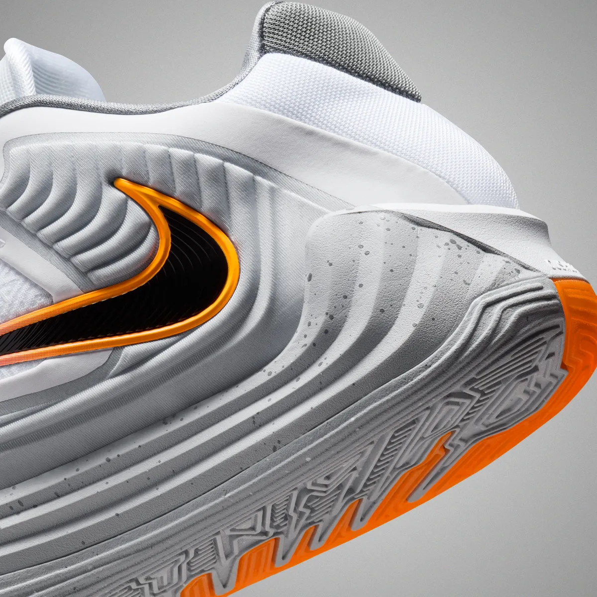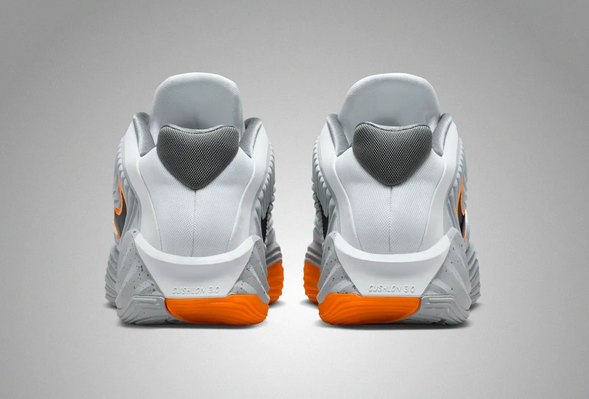 さらにサイドに配置された大型のスウッシュロゴはブラックの芯に鮮やかなオレンジの縁取りが施されており無彩色のボディの中で強烈なアクセントとして機能しています。このロゴの配置は前方から後方へ突き抜けるような勢いを感じさせ躍動感を視覚的に強調しています。