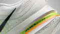 外観に目を向けるとまず目に飛び込むのはアッパーを包み込む幾重もの曲線的なレイヤー構造です。ホワイトを基調としたメッシュ素材の上をウルフグレーの波打つようなラインが並走しシューズ全体に流動的な動きを与えています。このグレーの曲線部分は立体的な凹凸を持っており触れた際にもその確かな存在感を感じることができます。