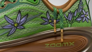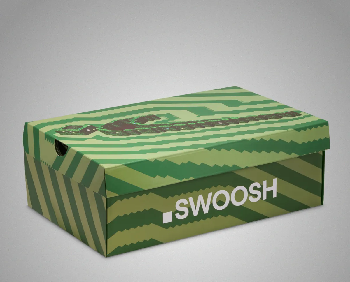 このモデルはナイキのデジタル特化ラインである .SWOOSH から生まれた一足でバーチャル世界の創造性を実際のプロダクトへ落とし込む試みが反映されています。.SWOOSH の特別ロゴが施されたボックスは森を思わせる濃淡グリーンのグラフィックが走りデジタルと自然が混ざり合うような視覚的な奥行きを生みます。外箱を開くとモデルのコンセプトと響き合う専用デザインが迎えパッケージ全体が体験の一部として成立します。