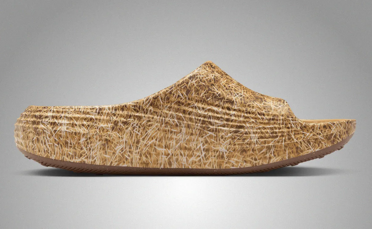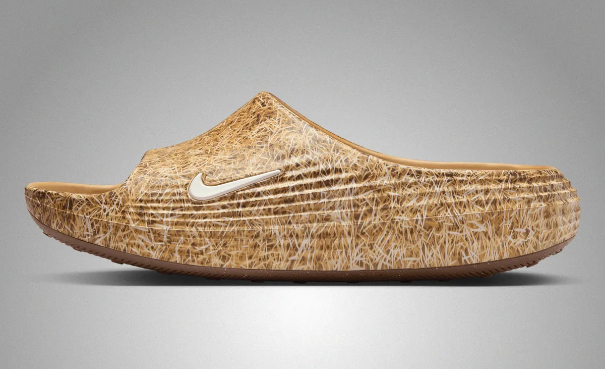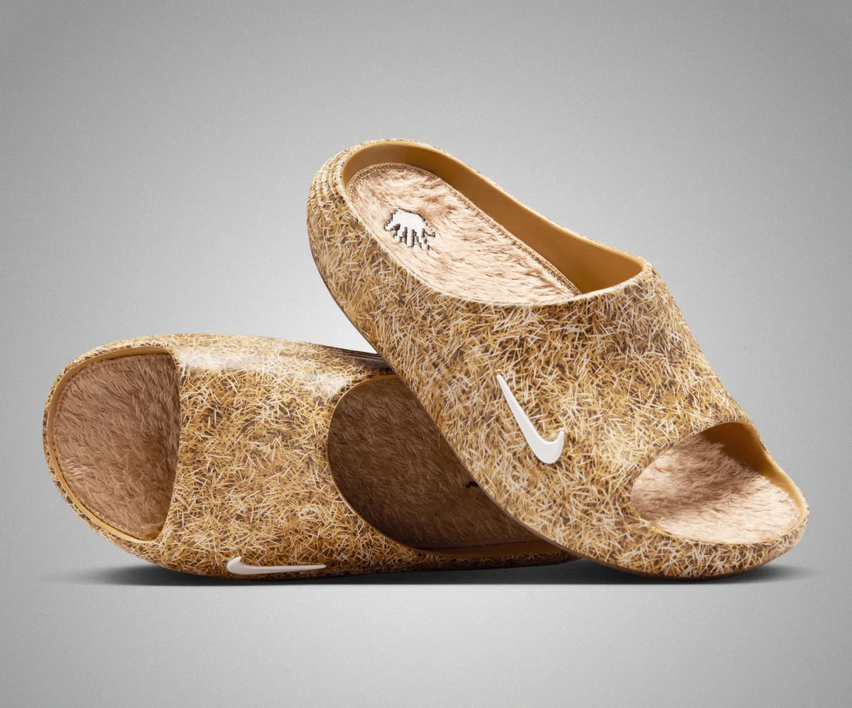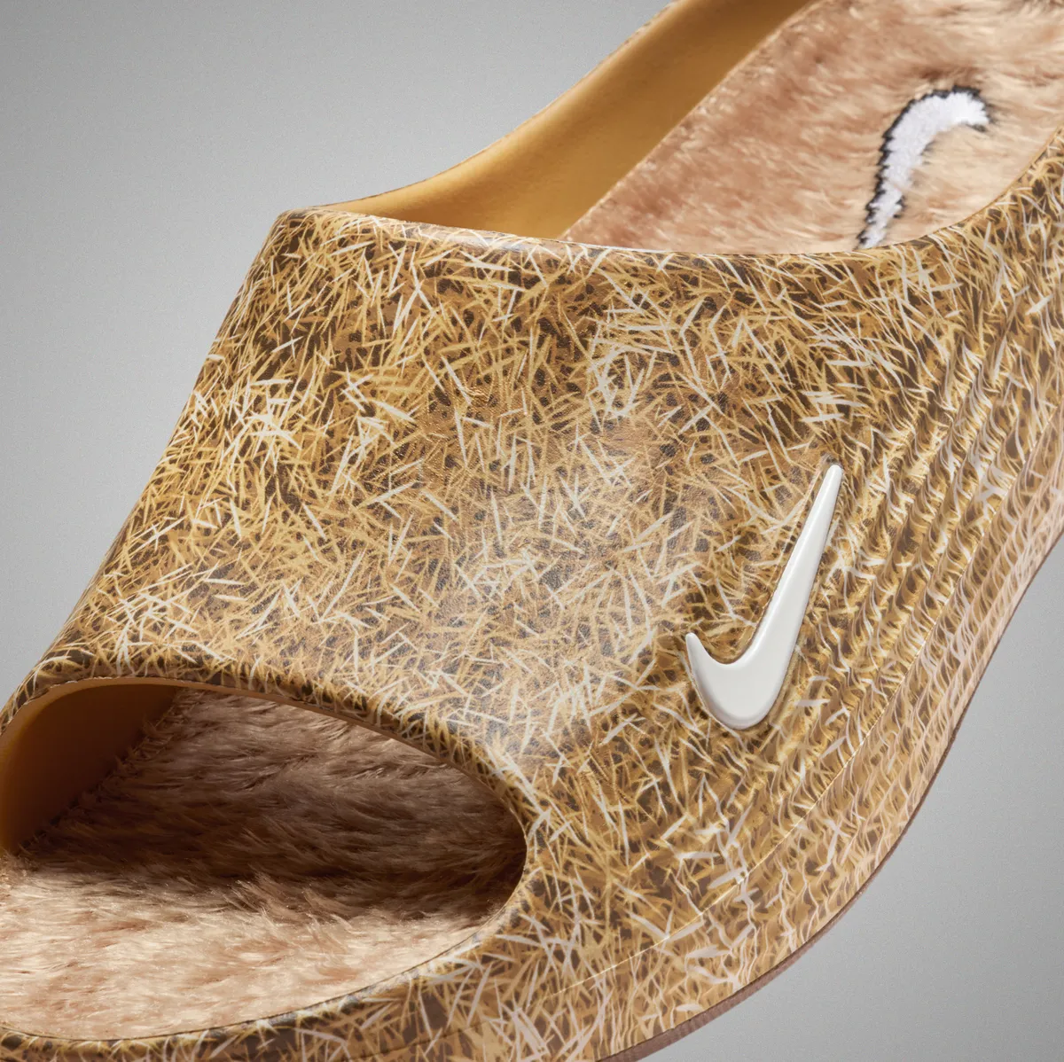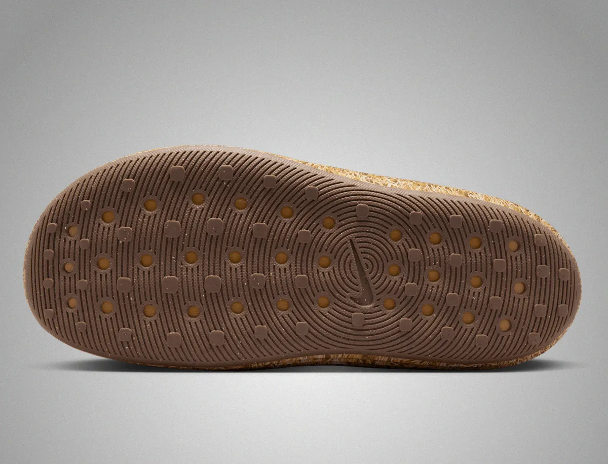 アッパー一面には枯れ草を思わせる繊細なプリントが広がり乾いた大地の表情をそのまま閉じ込めたような複雑な模様が重なります。淡いウィートのトーンを基調にまるで細い繊維が絡み合って層を成すような視覚が生まれ手に取ると立体的な深みが際立ちます。滑らかに傾斜する甲部分のラインは軽やかさと安定感を同時に抱え足元に自然な流れを描く形状へとまとめられています。サイドに寄り添うスウッシュは控えめなセイルで縁取られ素材の表情を邪魔しない柔らかなコントラストを生みます。